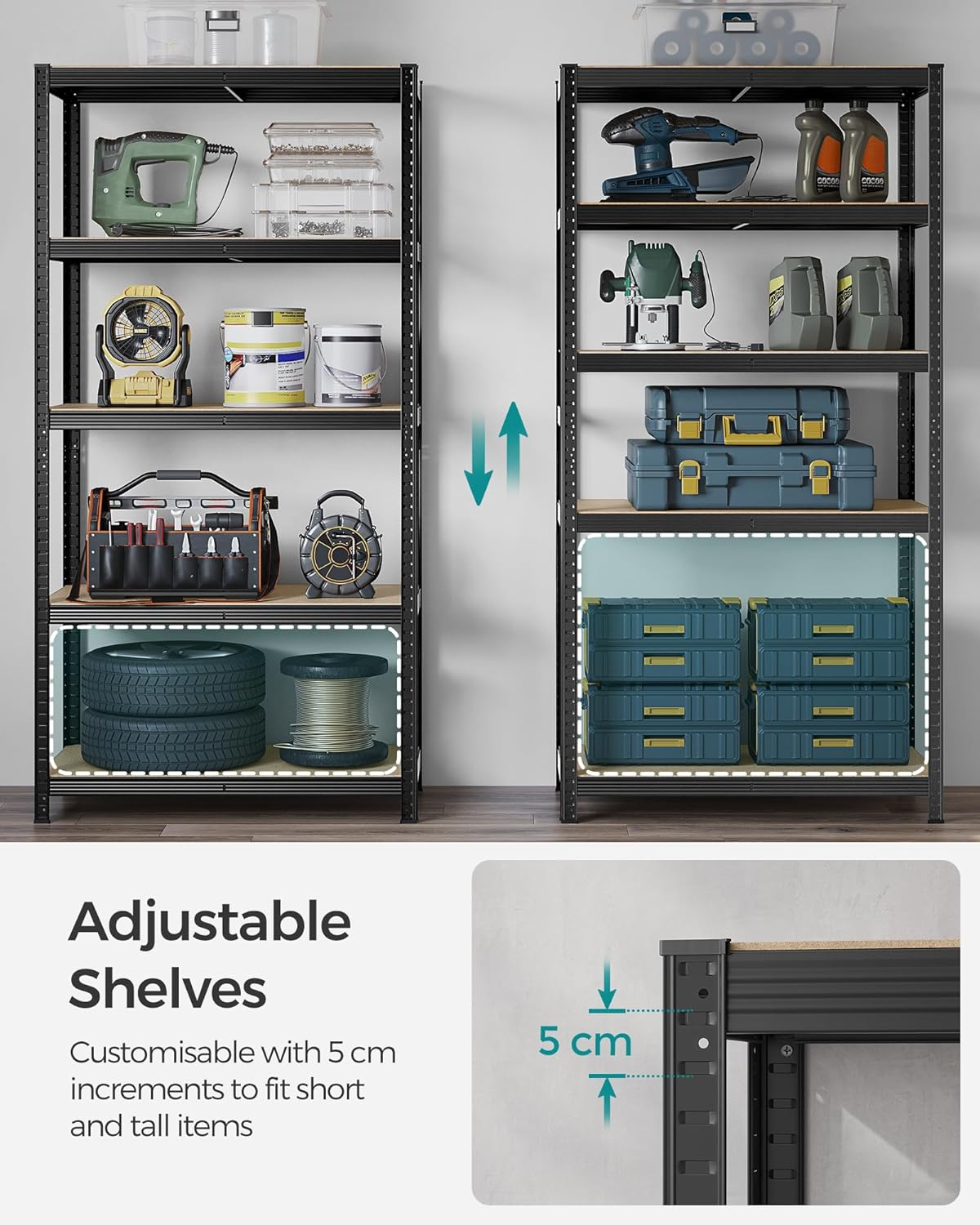 Specificatii: Culoare: maro rustic, negru Material: cadru din otel, placi aglomerate Dimensiunea produsului: 50 x 100 x 200 cm  (D x L x H) Greutatea produsului: 9,1 kg Capacitate de incarcare statica pe nivel: 120 kg Capacitate de incarcare statica totala: 600 kg Despre acest articol Aceasta unitate de rafturi pentru garaj este realizata cu un cadru din otel, iar fiecare nivel poate sustine pana la 120 kg. Kitul anti-inclinare inclus ajuta la atasarea raftului la perete, facandu-l mai stabil si mai sigur.Aceasta unitate de rafturi metalice poate fi impartita in 2 unitati separate pentru a se potrivi nevoilor dvs. de depozitare si spatiului dvs.; odata impartite, acestea functioneaza, de asemenea, excelent ca bancuri de lucru cu depozitare. Fiecare nivel poate fi ajustat cu usurinta la fiecare 5 cm.Cu dimensiuni de 50 x 100 x 200 cm si o capacitate de incarcare totala de 600 kg, aceasta unitate de rafturi poate fi utilizata intr-un garaj, depozit, pivnita sau camera de utilitate pentru a va organiza toate uneltele si echipamentele.Cu un design cu interblocare si instructiuni clare, aceasta unitate de rafturi de mare rezistenta este usor de asamblat si nu necesita unelte.
