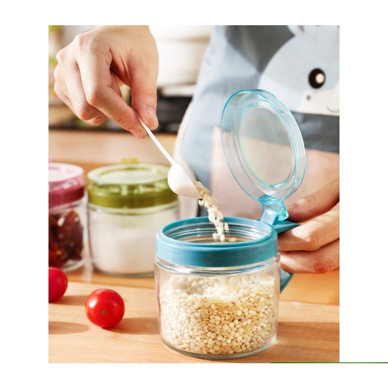 Recipient Condimente , din Sticlă, 180 ml, cu Mâner și Linguriță, 8 x 9 cm, Capac Transparent