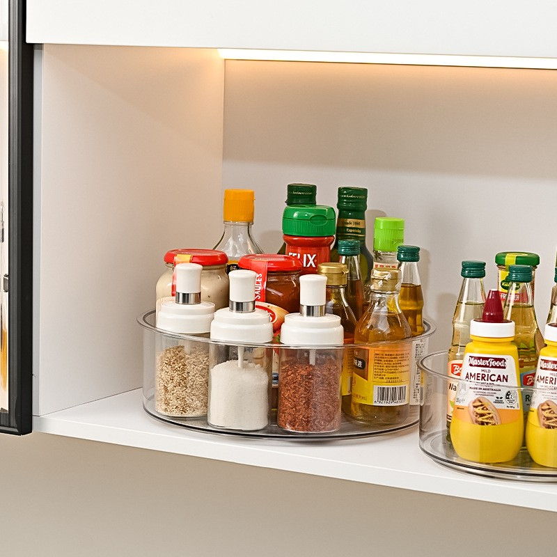 Permite depozitarea eficientă prin rotație a articolelor de bucătărie și cămară, fie în dulapuri, pe rafturi sau în interiorul frigiderului.