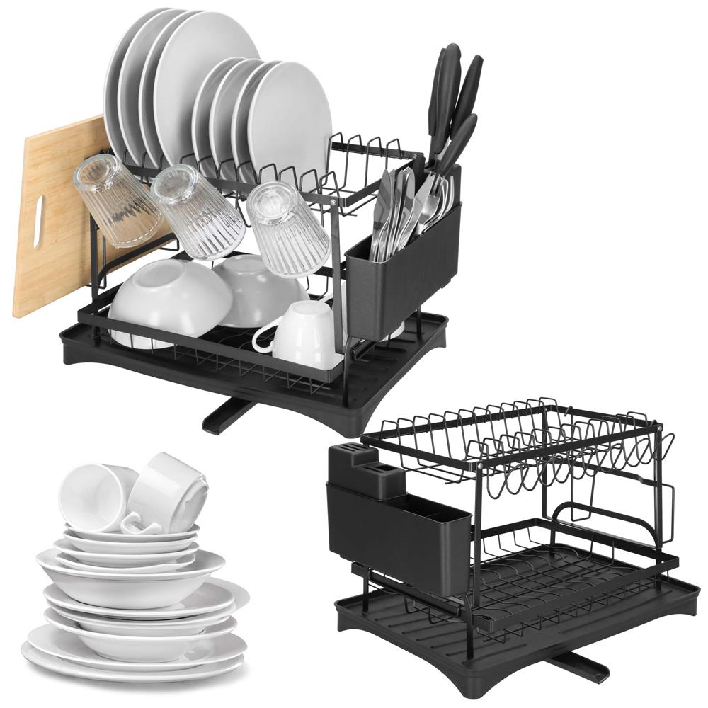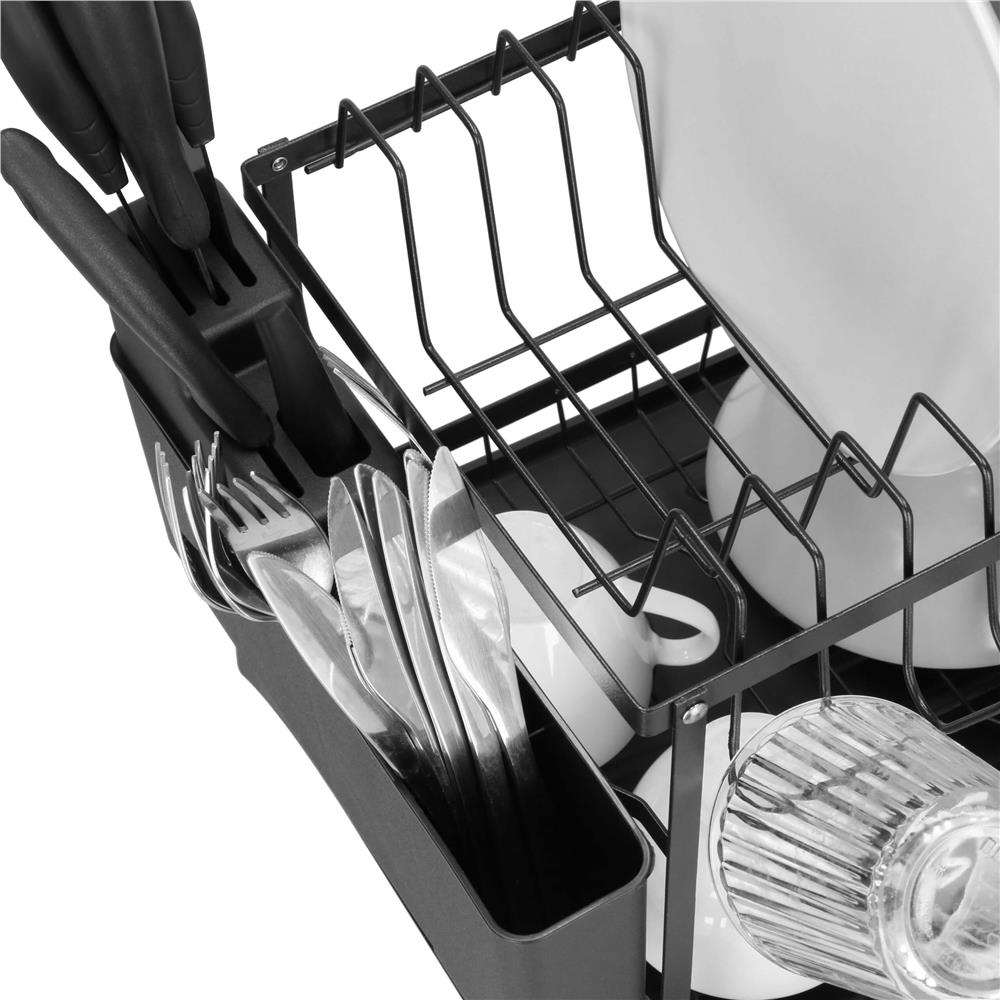 Specificatii tehnice Material: Otel, plastic Culoare: Negru Dimensiuni totale: Lungime 42 cm, latime 30 cm, inaltime 31,5 cm Dimensiuni tava scurgere: 42x30x4 cm Lungime scurgere reglabila: 11-19 cm Dimensiuni nivel 1: 36x29x10,5 cm Dimensiuni nivel 2: 37x27,5x20 cm Distanta intre niveluri: 2,5 cm (baza – nivel 1), 20 cm (nivel 1 – nivel 2) Dimensiuni compartimente suport vase: 2,5x8,5 cm; 2x6,5 cm; 4x2,5 cm; 3x2,5 cm Dimensiuni suport tacamuri: 25,5x5x10,5 cm Dimensiuni orificii tacamuri: Lungime 2,5 / 3,8 / 4,6 cm; diametru 4 / 17,5 mm Grosime rame si tuburi: Rame tava 4 mm, rame suport 2 mm, tuburi structura 1,8 / 2 / 2,3 / 2,5 / 4 mm Scurta descriere Suport de vase pe 2 niveluri, cu tava de scurgere si suport detasabil pentru tacamuri, ideal pentru uscarea eficienta a farfuriilor, paharelor si ustensilelor. Construit din otel rezistent cu finisaj negru si elemente din plastic de calitate, are un design elegant, capacitate mare si este usor de curatat. Caracteristici principale Structura stabila si rezistenta 2 niveluri pentru uscarea vaselor Suport detasabil pentru tacamuri Suport lateral pentru prosop sau tocator Capacitate mare de organizare