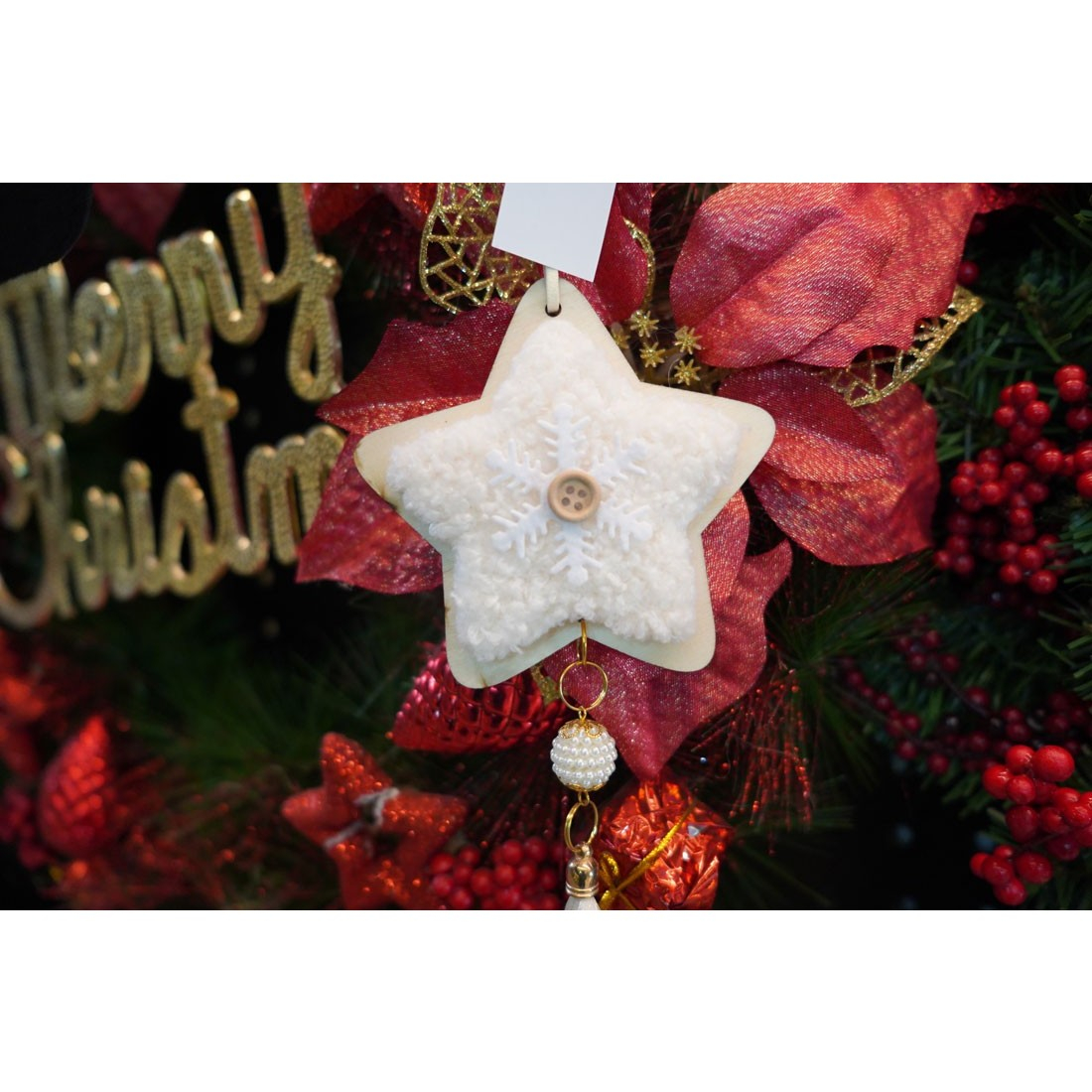 Ornament de brad stea, , alb, lemn/textil, 25 cm