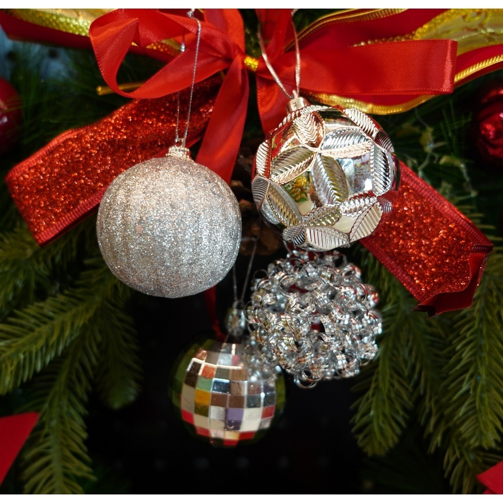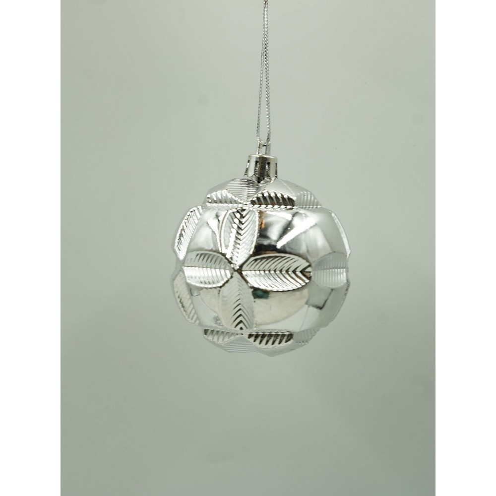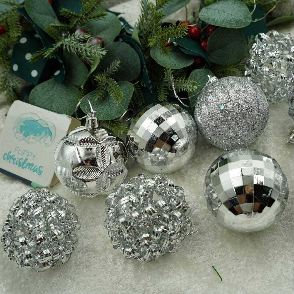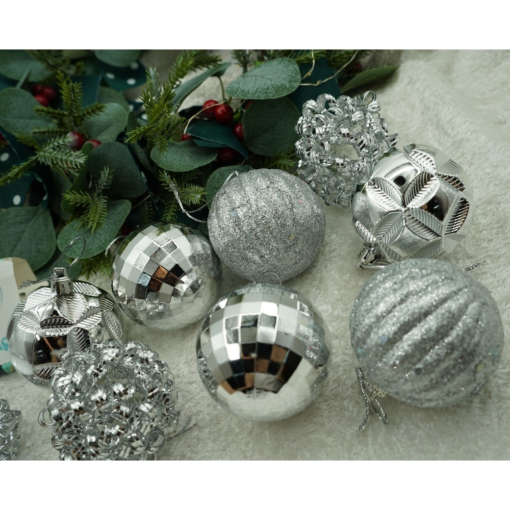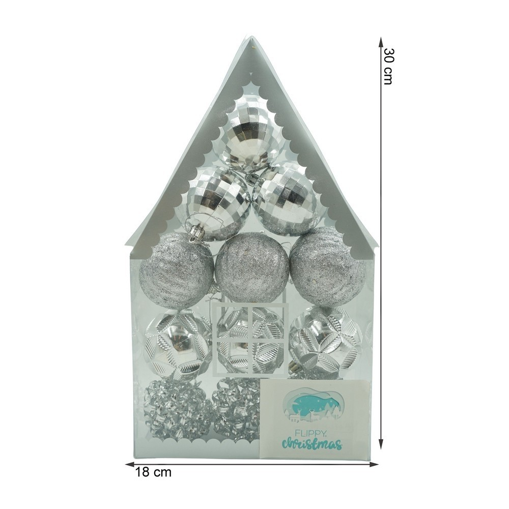 Set de 12 ornamente de brad, , de tip Glob, Argintiu, din plastic, cu finisaj sclipitor , cutie 6 cm adancime x 30 cm inaltime x 18 cm lungime)