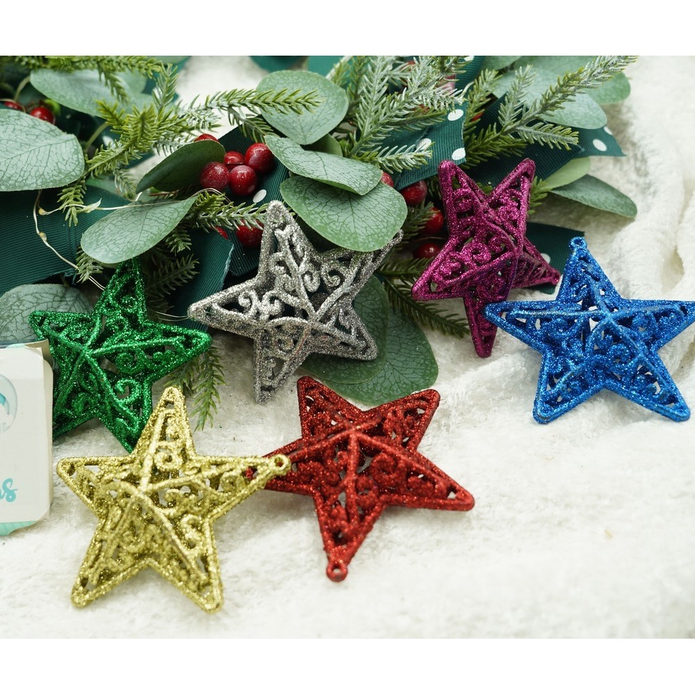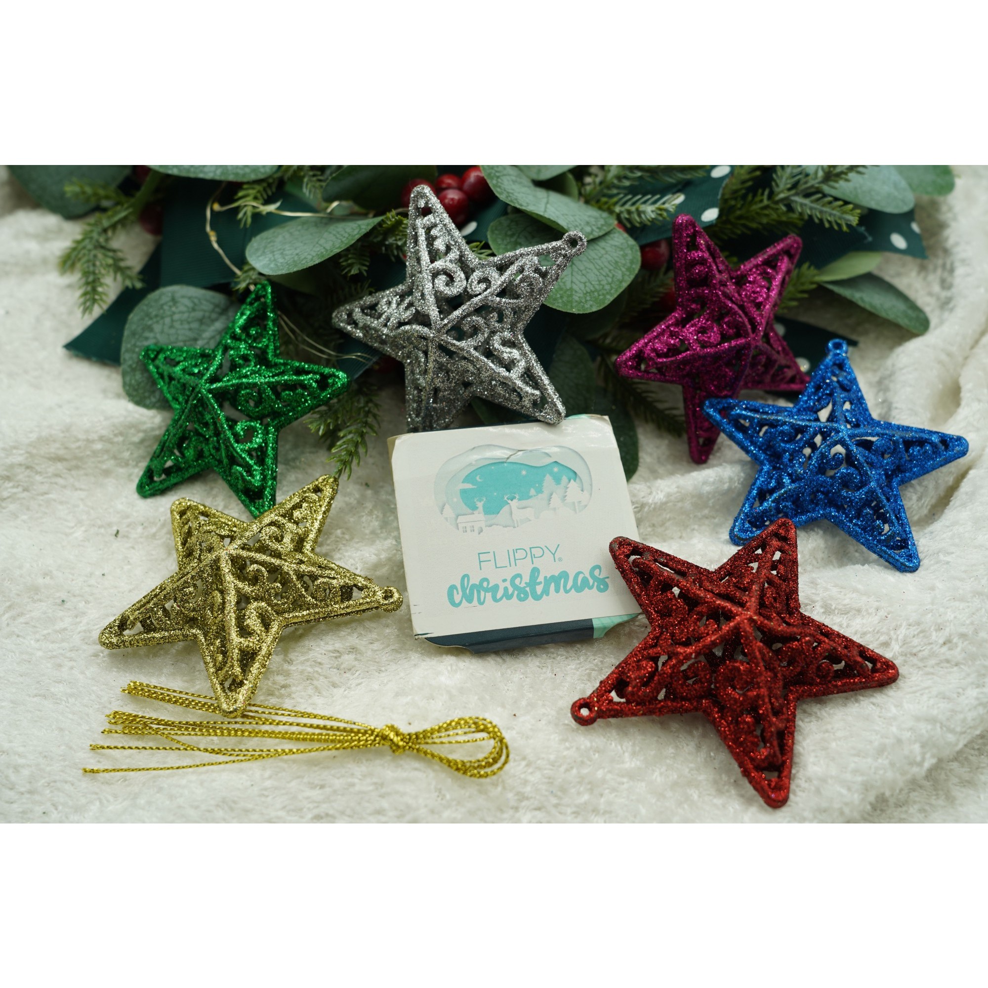 Set de 6 ornamente de brad, , de tip Stea, Multicolor, din plastic, cu finisaj sclipitor , cutie 3 cm adancime x 31 cm lungime x 9 cm inaltime