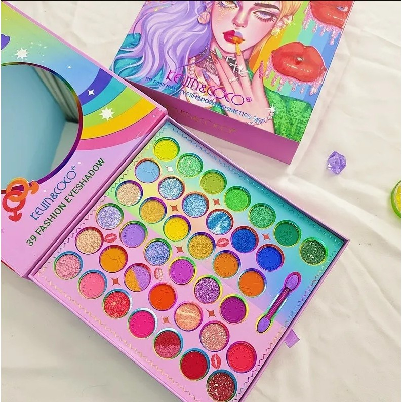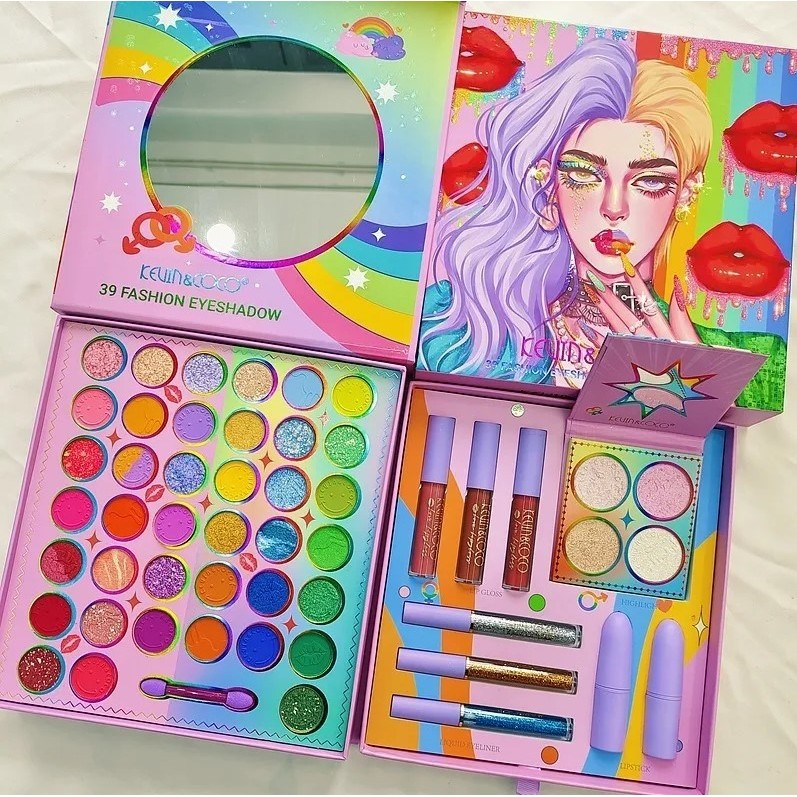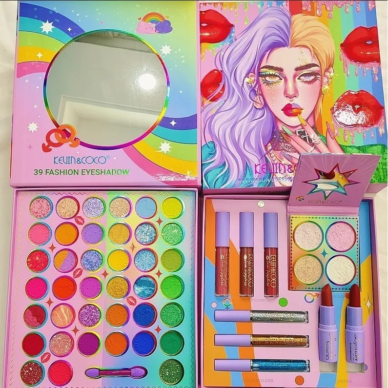 Set de Machiaj, Kevin & Coco, 39 de Culori, pigmentate, Fard de ochi, Ruj, Gloss, Tus, Fard Obraz, Curcubeu