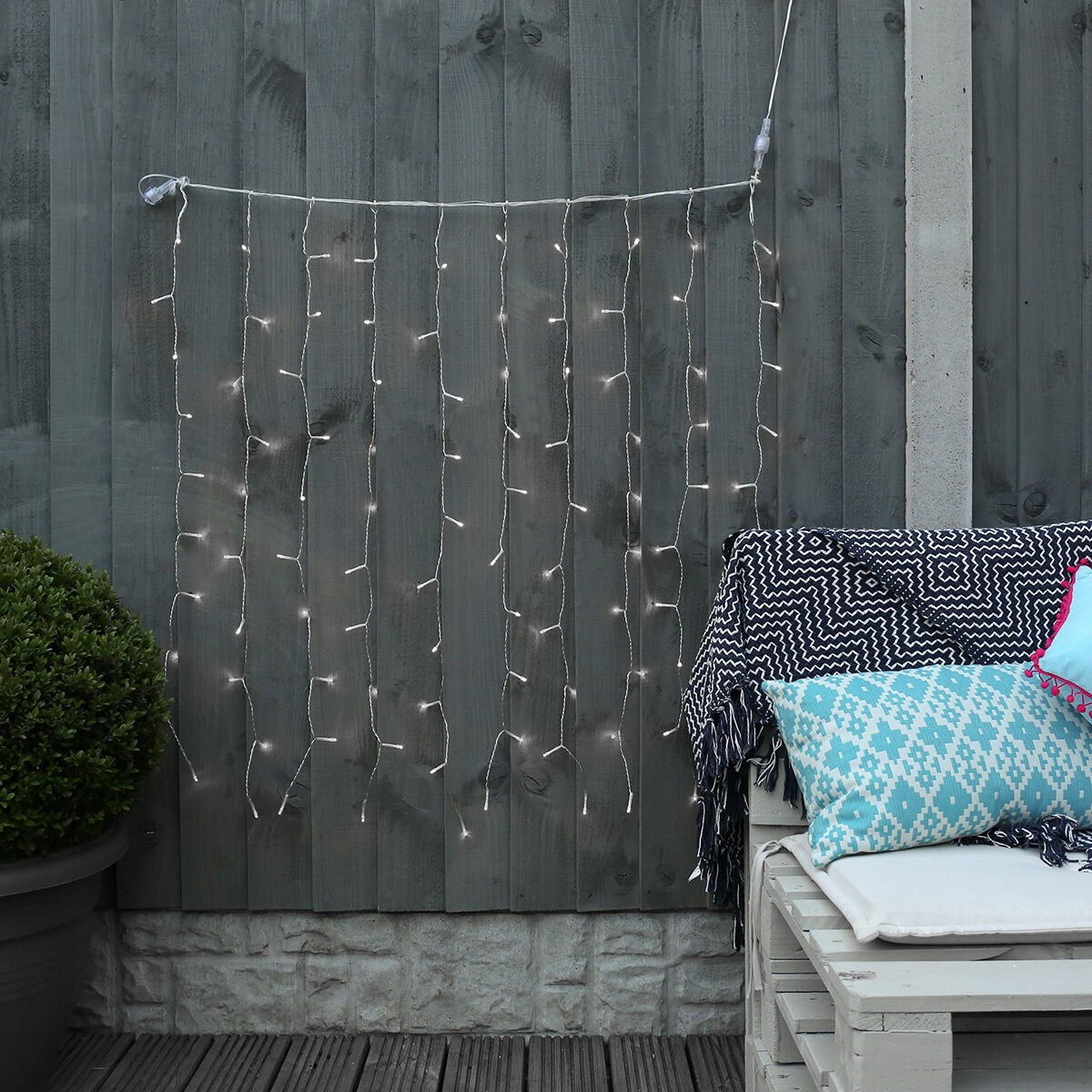 Instalatia de Craciun iti aduce lumina Craciunului prin cele 240 de LED-uri de culoare alb rece, dispuse sub forma de perdea. Tehnologia LED si cele 8 functii de jocuri de lumini cu siguranta vor creea un cadru festiv oriunde iar transparenta firului mentine vizual efectul luminitelor. Cele 8 jocuri de lumini sunt urmatoarele: lumina continua, blit, flash, secventa, unda, amestec, flux lent, stralucitor. Ghirlanda ofera o suprafata luminoasa de 3x3m iar lungimea cablului de alimentare este de 3 metri. Cablul este din plastic, cu grad de protectie IP44 ce garanteaza rezistenta la umiditate, inghet si patrundurea corpurilor straine solide cu diametrul de 1 mm si mai mari si este compus din fire de cupru. Este o alegere ideala pentru decorarea exteriorului casei tale.
