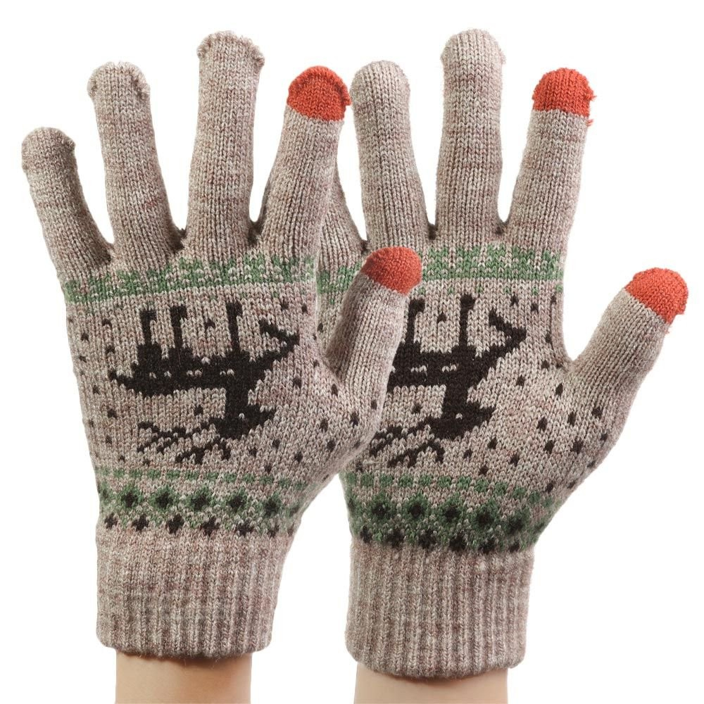 Manusi de Dama, , Model Ren, Functie Touchscreen (ecran tactil), Material Acril Tricotat, Manseta Elastica, Interior Catifelat, Marime Universala, Kaki Mănușile de damă cu model ren ...