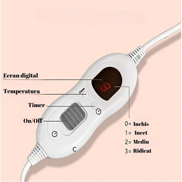 Nu trebuie sa ne facem griji pentru setarile complicate ale parametrilor. Regulatorul de temperatura, afisarea controlerului si indicatorul de reglare a incalzirii va vor ajuta sa controlati setarile si functionarea paturii si sa le adaptati la preferintele dvs. personale. Butonul de setare a temperaturii amplasat intr-un loc usor accesibil va permite sa alegeti modul de operare adecvat. Pentru utilizarea de zi cu zi, produsul va necesita 15 minute de incalzire inainte de culcare. Datorita acestui fapt, putem preveni rigidizarea musculara de dimineata. Cronometrul intr-un loc usor accesibil va permite sa setati 1, 2 sau 10 ore sau sa activati modul „mereu pornit”.