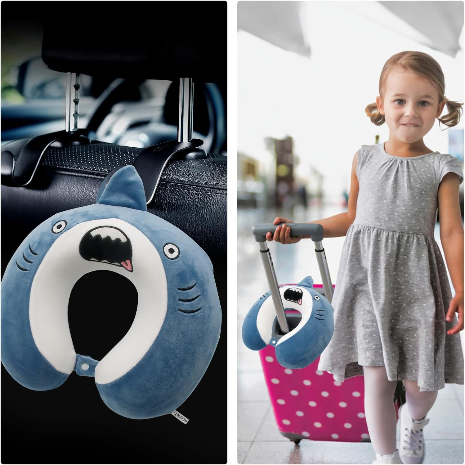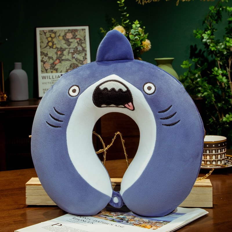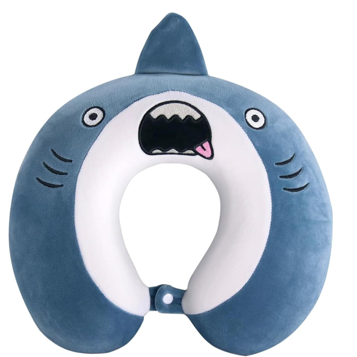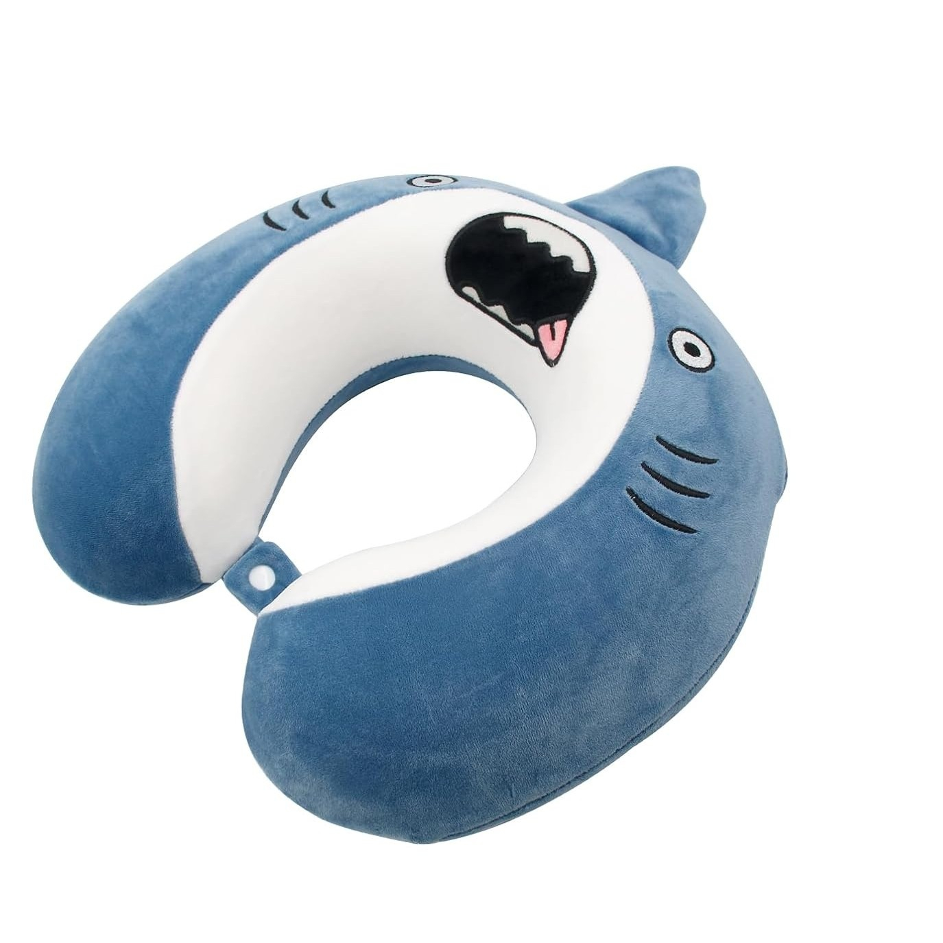 Perna de Calatorie in Forma de U, , Pentru Gat si Cap, Umplutura din Spuma cu Memorie, 30x30 cm, Model Rechin, Accesoriu de Voiaj, Birou, Masina, Sistem Prindere Capse, Albastru