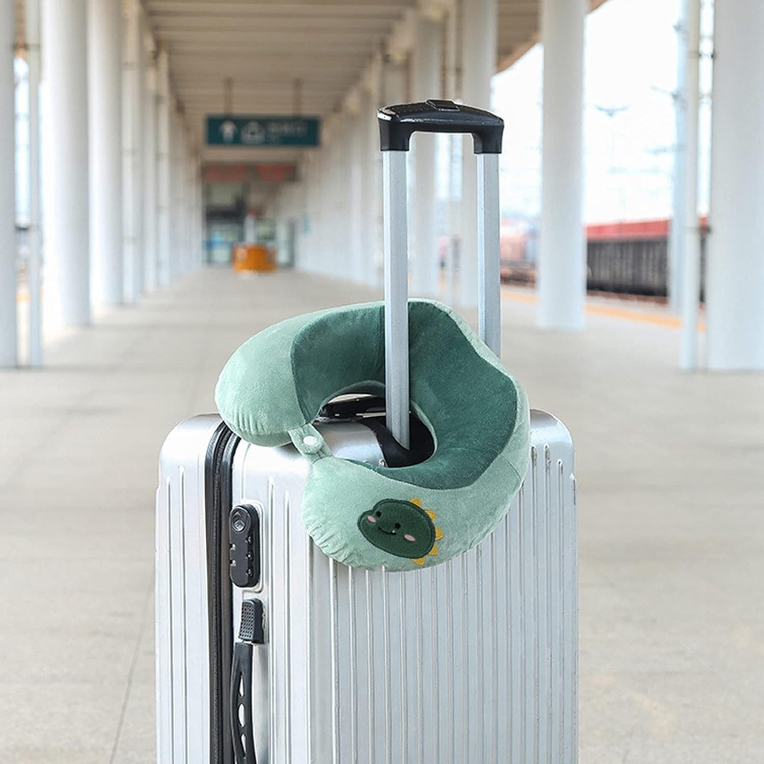 Perna de Calatorie, , Pentru Gat si Cap, Umplutura din Bumbac, 28x28x10 cm, cu Model Brodat Dinozaur, Verde