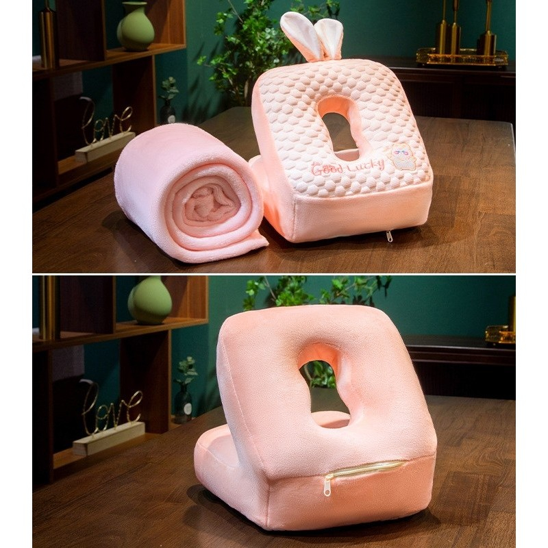 Setul 2in1 combină confortul unei perne ergonomice cu versatilitatea unei pături din microfibră. Cu un design adorabil, model iepuraș, și culori pastelate, acest set este ideal pentru birou, călătorii sau pauze de relaxare. Materialele de calitate asigură un somn confortabil și o experiență plăcută.