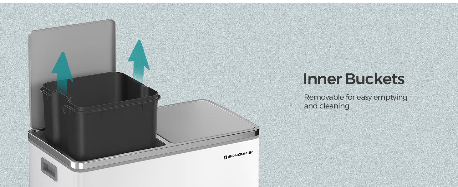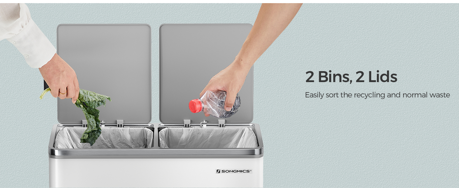 Specificatii tehnice: Brand: SONGMICS Culoare: Alb/gri Capacitate totala: 60 litri (2 x 30L) Material: Otel vopsit electrostatic, capace ABS, galeata interioara din plastic PP Dimensiuni...