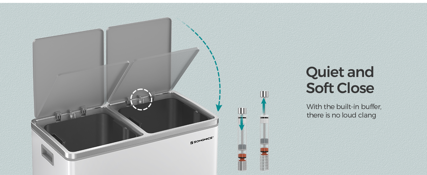 Specificatii tehnice: Brand: SONGMICS Culoare: Alb/gri Capacitate totala: 60 litri (2 x 30L) Material: Otel vopsit electrostatic, capace ABS, galeata interioara din plastic PP Dimensiuni exterioare: 58.6x32x65 cm Dimensiuni galeata interioara: 27x27x58.5 cm Inaltime cu capacul deschis: 94 cm Forma: Dreptunghiulara Deschidere: Pedale Caracteristici speciale: 2 compartimente, inchidere silentioasa, galeata detasabila cu manere Utilizare recomandata: Deseuri si reciclare in bucatarie Scurta descriere: Cosul de gunoi dublu de la SONGMICS ofera o solutie practica si eleganta pentru colectarea separata a deseurilor. Cu un design modern alb/gri si 2 compartimente de cate 30L, permite sortarea usoara a reciclabilelor. Capacele cu inchidere silentioasa si galeata interioara detasabila asigura confort si igiena in orice bucatarie. Caracteristici principale: 2 compartimente de cate 30L pentru reciclare eficienta Capace cu inchidere lenta si silentioasa Sistem de deschidere cu pedale, fara atingere Include 2 galeti interioare cu manere pentru golire usoara Constructie stabila, rezistenta la copii si animale Design modern, potrivit pentru bucatarii elegante Fabricat din otel vopsit electrostatic, usor de curatat Inaltime totala cu capacul deschis: 94 cm