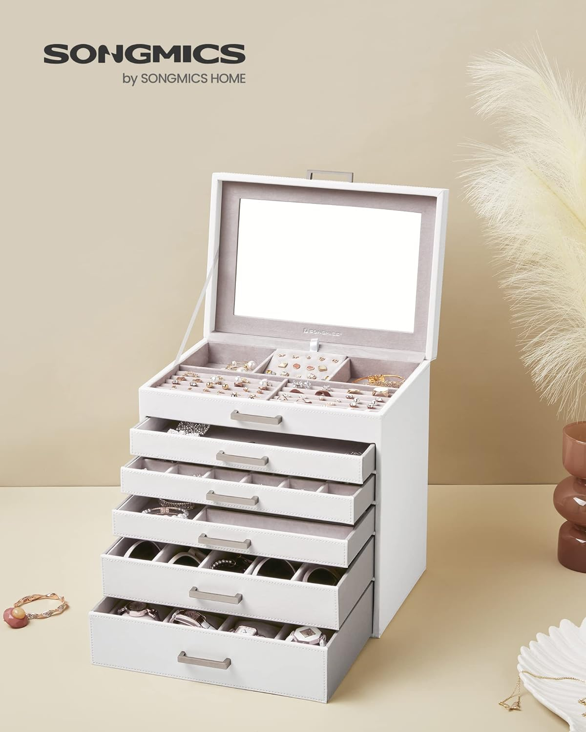 SONGMICS Cutie de bijuterii din MDF cu 6 nivele, 5 sertare, cu oglinda 31x32x22cm, alb