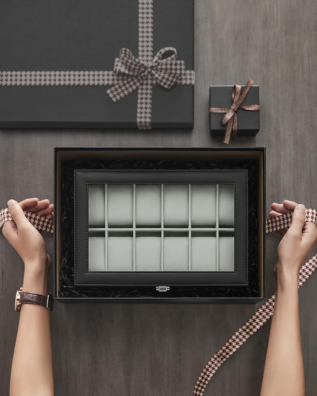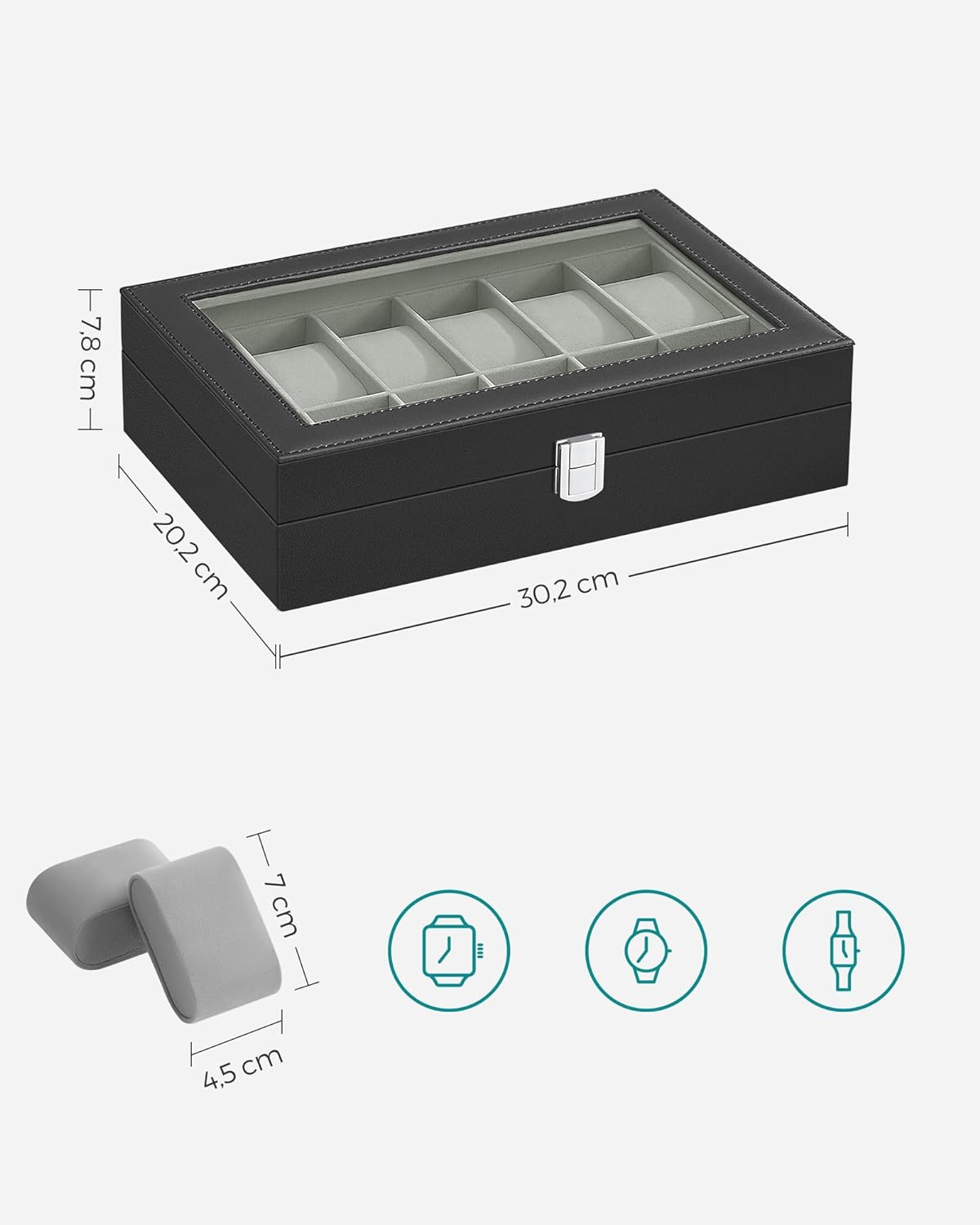 SONGMICS Cutie depozitare si organizare ceasuri, cu 12 locuri, piele sintetica, cu capac de sticla, 20x30x8cm, negru