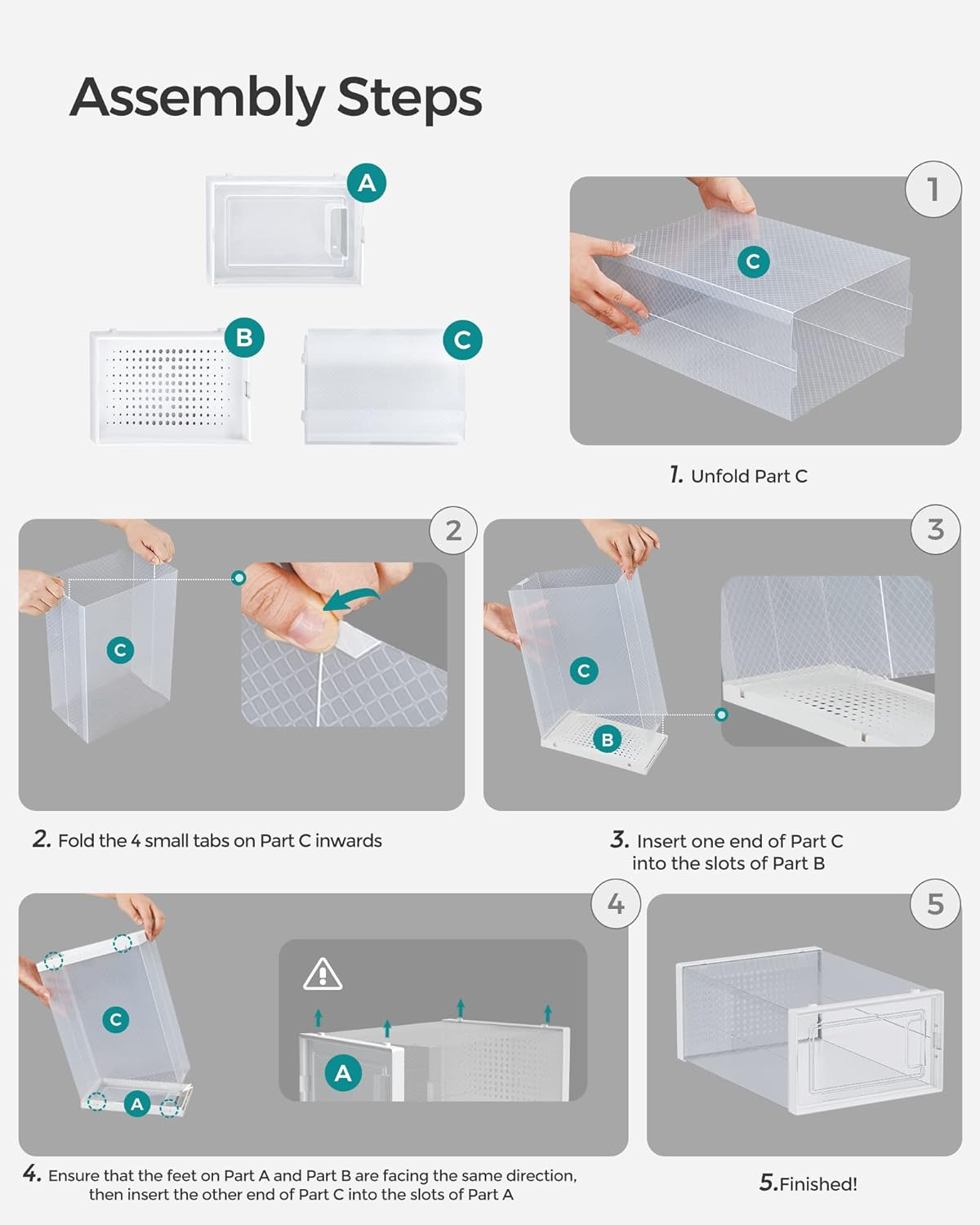 Specificatii: Culoare: Transparent, alb Material: Corp din plastic PP (polipropilena), usa frontala PP (polipropilena), cadru din plastic ABS Dimensiunea cutiei unice: 35 x 25,2 x 25,2 x 19 cm cm (L x l x i) Dimensiunea interna a cutiei unice: 32,7 x 24,5 x 17,8 cm (L x l x i) Greutatea produsului: 7,5 kg Despre acest articol Acest set de 18 cutii modulare pentru depozitarea pantofilor este o solutie practica si eficienta pentru a organiza si depozita pantofii intr-un mod ordonat si protejat. Aceste cutii modulare sunt concepute special pentru a oferi o solutie de depozitare pentru pantofii tai.Daca vrei sa depozitezi cutiile intr-un mod organizat, design-ul corespunzator face stivuirea lor o joaca de copii; orificiile de ventilatie permit pantofilor tai sa respire.Asamblare rapida: Pur si simplu imbinati partea frontala, spatele si corpul impreuna si vei avea aceste cutii pentru pantofi cu dimensiuni interioare de 32,7 x 24,5 x 17,8 cm; fiecare pereche de adidasi, pantofi cu toc sau balerini va avea un loc al sau.Pachet de 18 cutii de pantofi transparente cu usa frontala transparenta, design stivuibil si pliabil, gauri de ventilatie. Spuneti la revedere de la pantofii imprastiati peste tot si puneti-va in ordine pantofii acum!