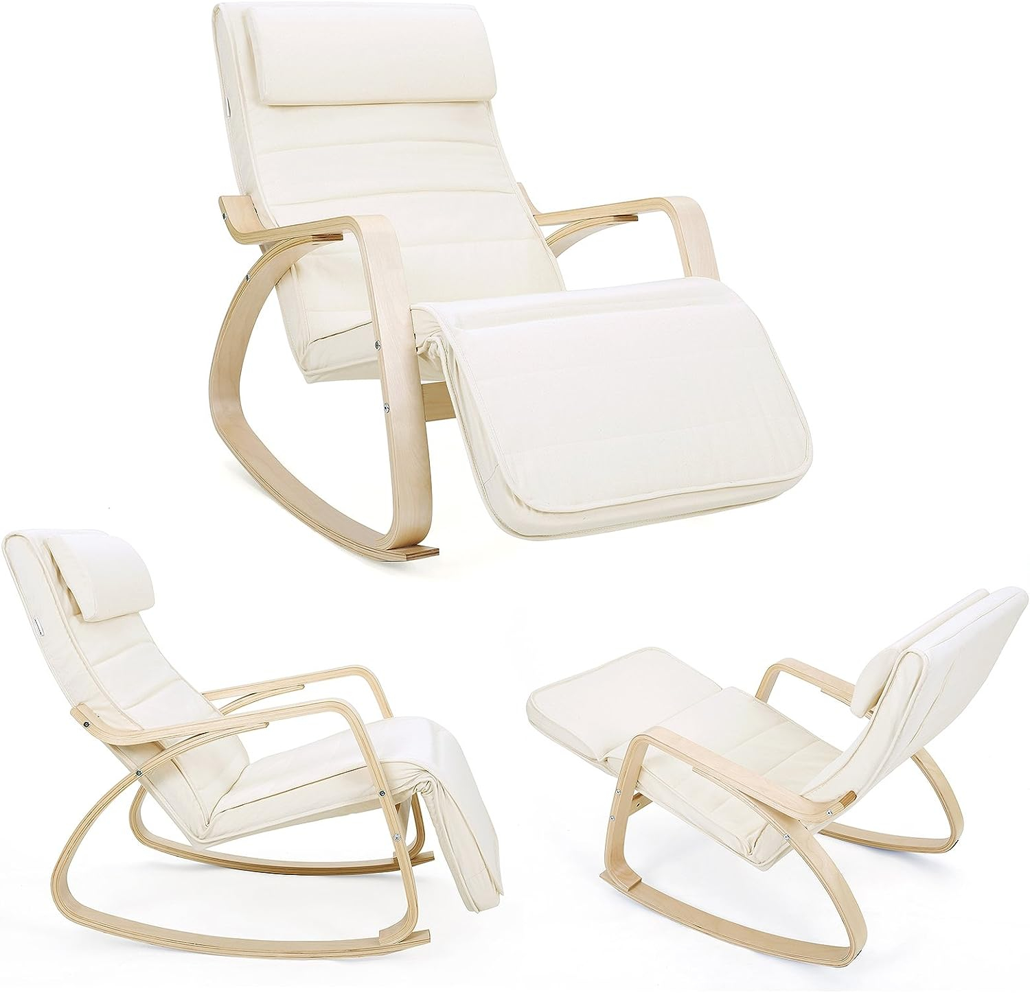 SONGMICS Scaun balansoar din lemn, suport picioare reglabil, maxim 150kg, 55x115x91cm, bej