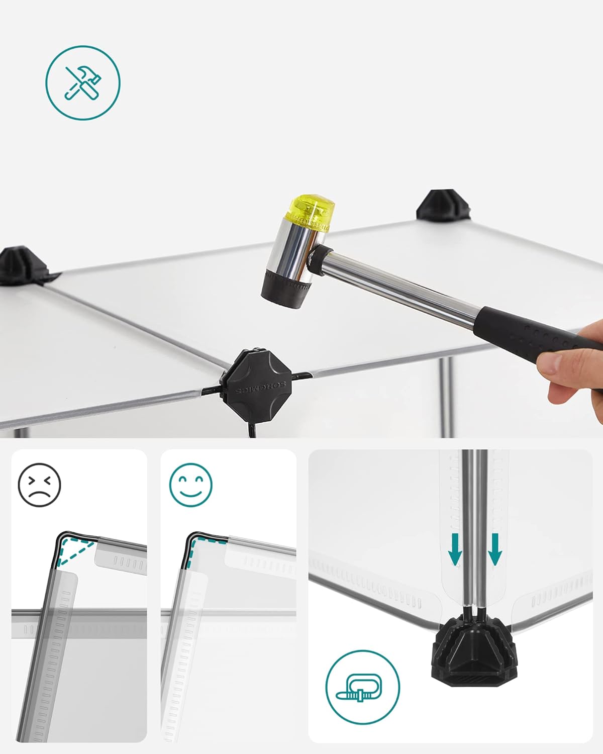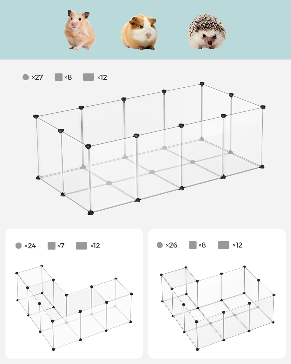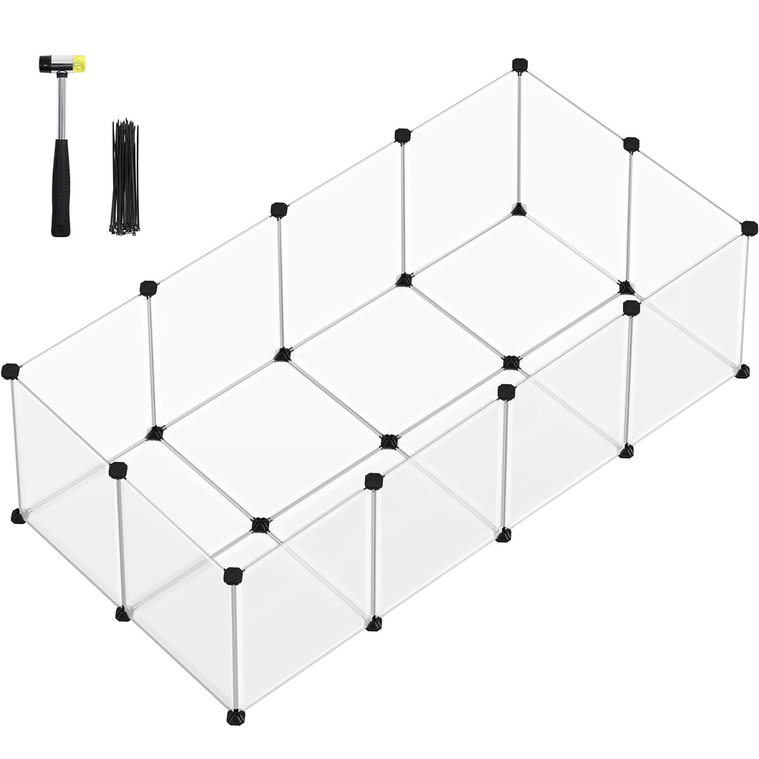Culoare: Alb Marca: SONGMICS Material: Plastic Dimensiuni produs: 143L x 71W x 47H cm Despre acest articol Asamblarea este usoara: Pur si simplu imbinati panourile de plastic cu conectorii cu mai multe unghiuri cu ajutorul ciocanului de cauciuc inclus, veti instala rapid acest parc pentru animale de companie. Structura modulara, usoara, face, de asemenea, usor de demontat sau deplasat.Spatios si sigur: Aceasta tarc pentru animale de companie ofera o zona spatioasa pentru, hamsteri, arici sau iepurasi pentru a alerga, a explora si a se distra. Panourile netede de 45 x 35 cm si 35 x 35 cm le ofera putine sanse de a iesi.Detalii preventive: Podeaua acestei custi pentru hamsteri nu numai ca imbunatateste stabilitatea, dar ofera si protectie eficienta pentru podeaua dumneavoastra. Panourile si conectorii din plastic sunt ferm conectati pentru a preveni ca animalele mici sa iasa.Personalizabil si extensibil: In limita pieselor incluse, aceasta carcasa pentru animale de companie poate fi configurata in forma de L pentru colturi sau stivuita intr-o casa cu 2 etaje.Translucid si usor de curatat: Panourile din plastic translucid va permit sa urmariti si sa interactionati cu micutii dvs. prieteni. Cand tarcul se murdareste, stergeti-l cu o carpa umeda.