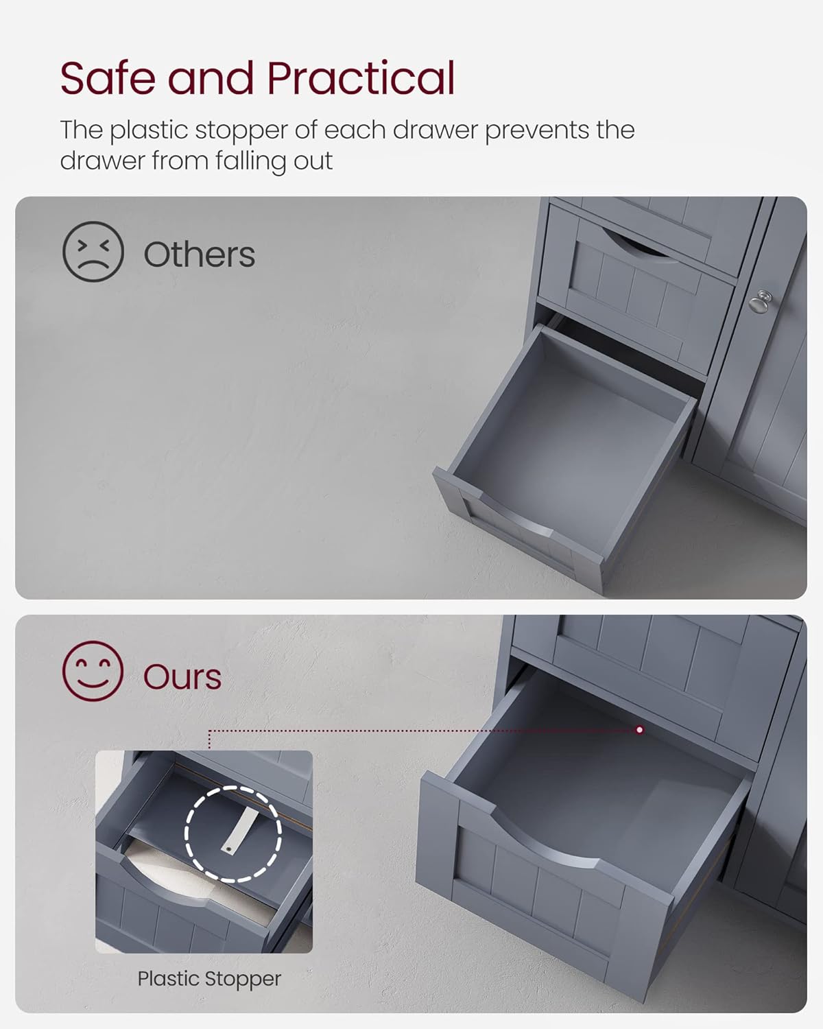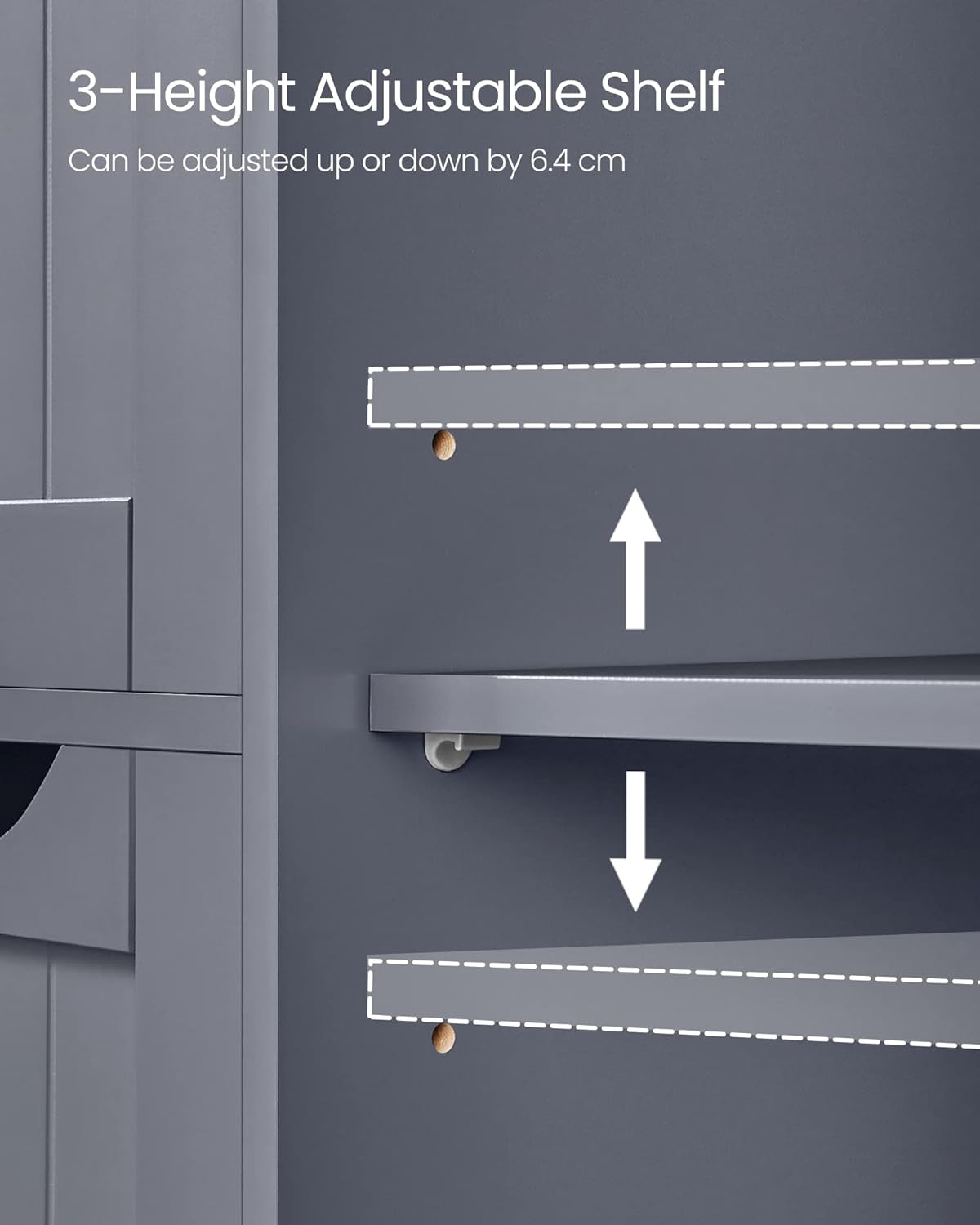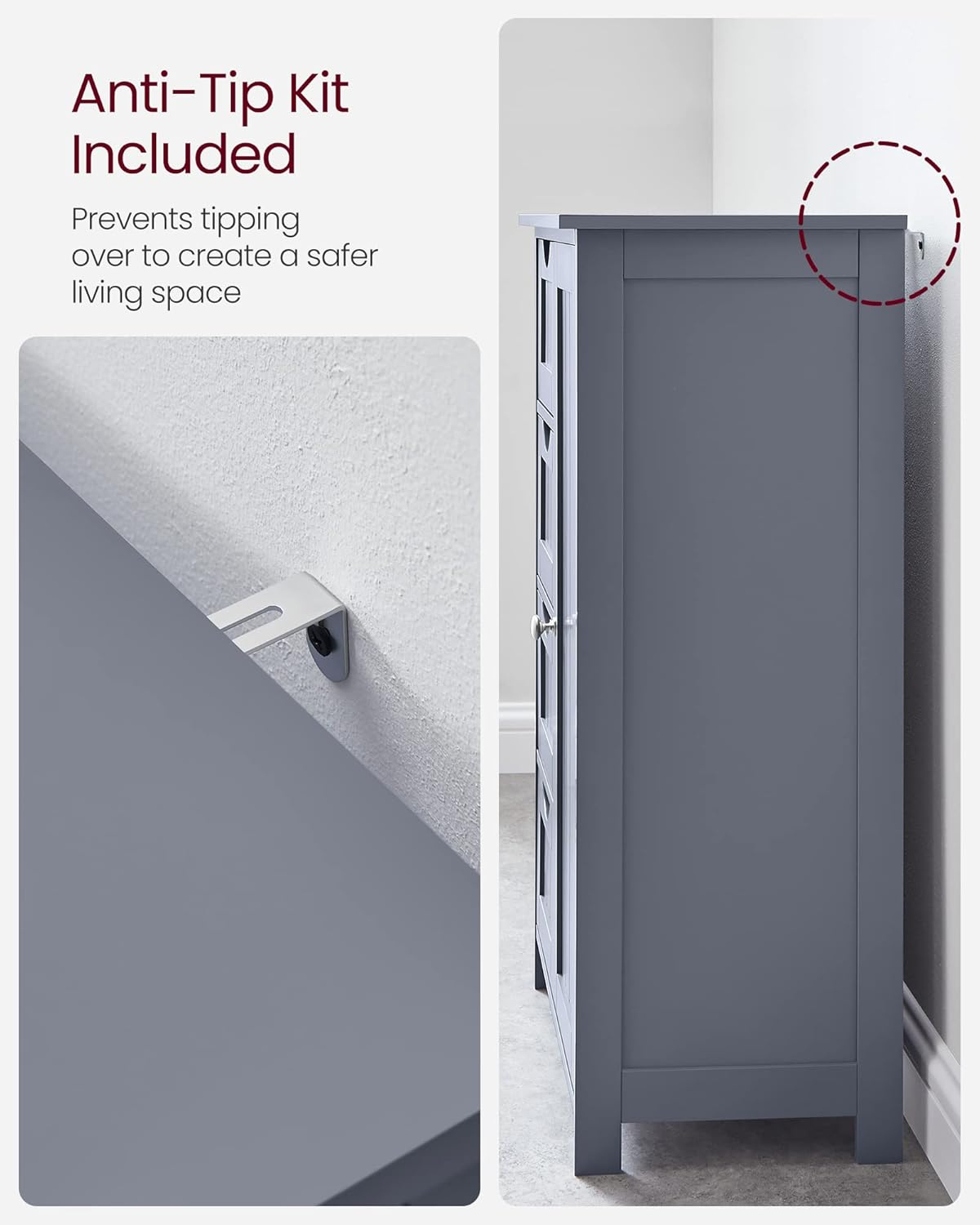Specificatii: Culoare: GriMaterial: MDF (placa de fibre de densitate medie)Dimensiunea produsului: 30 x 55 x 82 cm (D x W x H)Greutatea produsului: 12,5 kgMax. Capacitatea de incarcare statica a blatului mesei: 40 kgMax. Capacitatea de incarcare statica a fiecarui sertar: 5 kgMax. Capacitatea de incarcare statica a raftului reglabil: 15 kg Continutul pachetului: 1 x Dulap de podea pentru baie1 x Kit anti-inclinare1 x Punga cu accesorii1 x Instructiuni Note VASAGLE: Acest produs este rezistent la umiditate intr-o anumita masura, dar va rugam sa nu il expuneti la apa pentru perioade lungi de timp pentru a evita craparea si deformarea.Pentru siguranta, va rugam sa fixati produsul pe perete cu kitul anti-inclinare inclus. Depozitare asortata: articole frecvent necesare pe blatul mesei, articole mici in cele 4 sertare si raftul reglabil pe 3 niveluri din spatele usii pentru articole de diferite dimensiuni. Astfel, veti avea o baie ordonata Stabil si sigur: datorita panourilor robuste din MDF, acest dulap de baie este puternic si stabil; protectia la inclinare inclusa ofera stabilitate si siguranta suplimentare Compact, dar spatios: datorita designului compact, acest dulap de baie ocupa o suprafata de 30 x 55 cm, dar ofera suficient spatiu de depozitare. Cu acest dulap, puteti profita la maximum de spatiul limitat Aspect frumos: griul elegant si designul minimalist creeaza un dulap simplu, dar in acelasi timp cu caracter, care poate fi usor integrat in locuinta dvs. - in baie, in camera de zi sau pe hol Usor de instalat: nu va faceti griji cu privire la asamblare. Datorita pieselor marcate si instructiunilor clare, puteti monta rapid aceasta comoda cu sertare