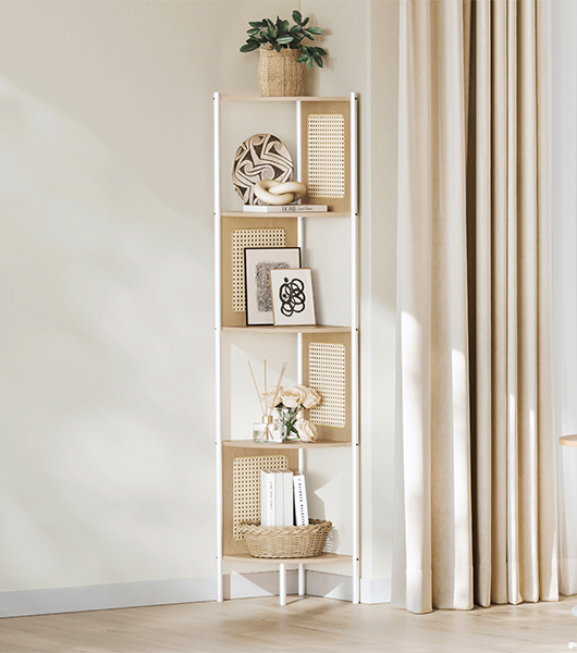 VASAGLE Raft de colt boho, cadru metalic, polite MDF si panouri poliratan, 32x32x156cm, bej