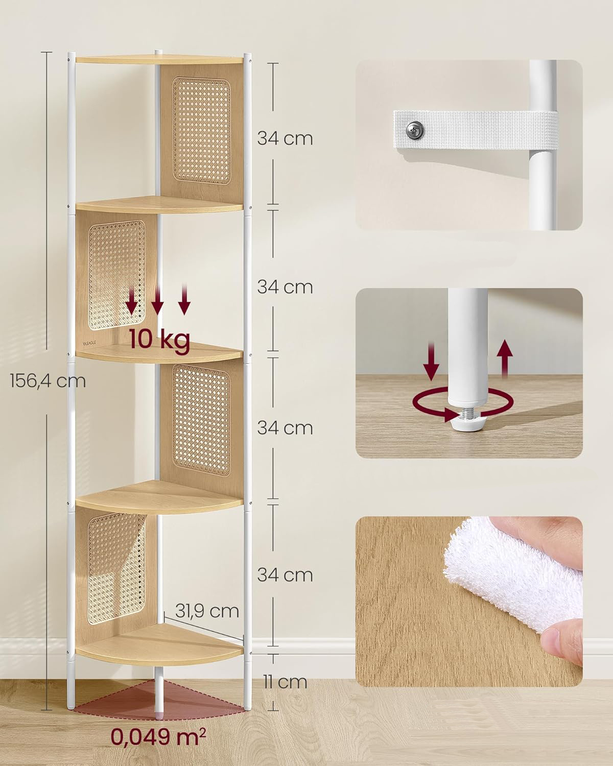 Detalii despre produs: Culoare: Bej Material: Otel, MDF (panouri din fibre de densitate medie), ratan PP (polipropilena) Dimensiuni: 31,9 x 31,9 x 156,4 cm (P x L x I) Greutate: 7,9 kg Capacitate maxima de incarcare statica pe nivel: 10 kg Despre acest articol Tuburile de otel simple se intalnesc cu aspectul de rattan - acest raft de colt simplu adauga o nota naturala si confortabila casei dvs. si aduce prospetime in orice colt. Masurand 31,9 x 31,9 x 31,9 x 156,4 cm, biblioteca ofera 5 rafturi pentru carti, rame de tablouri, plante si elemente decorative. Datorita formei sale, se potriveste perfect in orice colt si economiseste spatiu.Fie ca doriti sa va evidentiati piesele preferate in camera de zi, sa creati o oaza de lectura in birou, sa infrumusetati colturile dormitorului sau sa aduceti mai multa ordine in bucatarie, raftul de colt raspunde tuturor nevoilor dvs.Panourile din MDF de inalta calitate combinate cu otelul rezistent creeaza un raft solid si durabil. Cu o capacitate de incarcare de pana la 10 kg pe nivel, va puteti expune toate piesele preferate.Usor de asamblat si usor de curatat: Datorita pieselor marcate si instructiunilor clare, asamblarea este floare la ureche. Panourile din MDF sunt usor de curatat, astfel incat raftul dvs. sa arate intotdeauna impecabil.