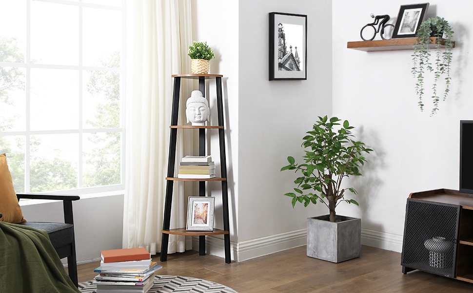 VASAGLE Raft de colt cu 4 etaje, tip biblioteca, cadru metal si polite lemn, industrial, 34x34x125cm, maro rustic