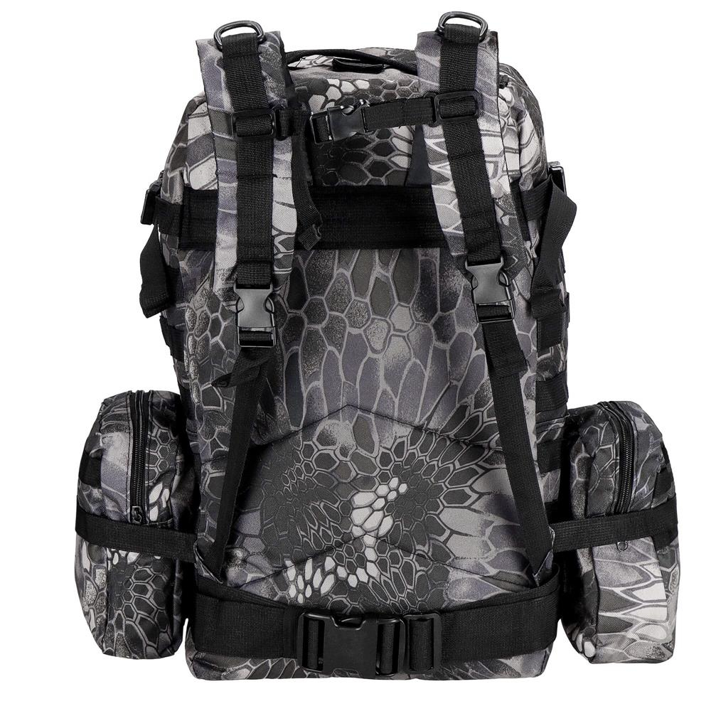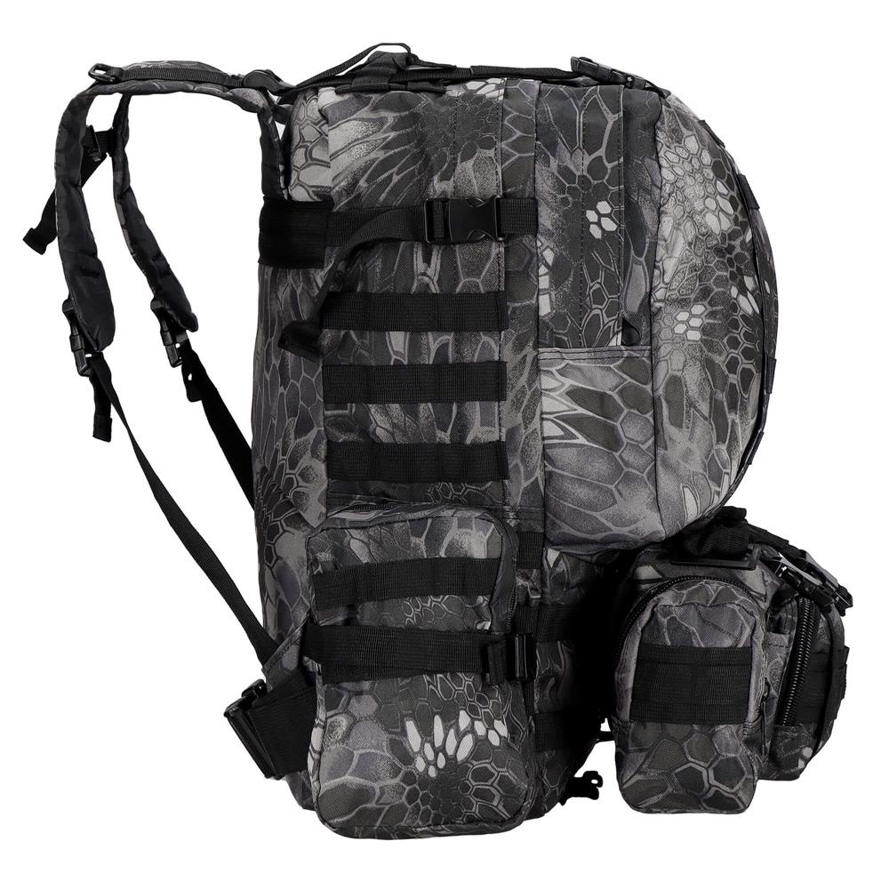 Material: poliester Catarame cu clichet: plastic Capacitate: 50L Rezistent la apa Inchidere: fermoar Buzunare laterale detasabile Dimensiuni: Inaltime totala 50 cm Latime totala 50 cm Adancime totala 40 cm Latimea compartimentului principal 30 cm Sistem de transport reglabil: 40 - 67 cm Catarama de centura reglabila: 36 - 70 cm  Rucsacul nostru a fost dotat cu numeroase compartimente suplimentare, detasabile, un sistem Molle de neinlocuit, sisteme de transport reglabile, o centura pentru solduri si o serie de alte avantaje: Rezistent la apa - materialul din poliester, in plus fata de interiorul cauciucat, asigura o protectie adecvata Sistem Molle - permite depozitarea si montarea altor accesorii importante Amelioreaza presiunea asupra coloanei vertebrale si a umerilor in timpul utilizarii Maner de transport - in partea superioara a rucsacului Catarame de blocare - continutul rucsacului este foarte bine protejat Buzunar ascuns 2x compartimente principale - foarte incapatoare In plus fata de compartimentul principal spatios, am echipat rucsacul nostru cu compartimente si buzunare suplimentare. Ca urmare, fiecare obiect din echipamentul dvs. isi va gasi locul in rucsac. In ciuda dimensiunilor sale mai mari, produsul are o greutate redusa, astfel incat confortul de utilizare este intotdeauna la un nivel ridicat. Rucsacul este dotat cu accesorii practice, care cu siguranta va vor fi de folos in timpul calatoriilor si vor creste confortul de utilizare: Curele reglabile: curele de sold si de umar. Elemente de spuma - pe spate si pe curelele de umar Buzunar ascuns pe spate Catarame din plastic, durabile Baza cauciucata a compartimentului principal Interiorul cauciucat al compartimentelor suplimentare Maner superior pentru al purta in mana