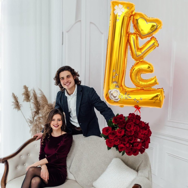 Balon din Folie Metalizata, , Figurine, Model LOVE, Tematica Iubire, 110x64 cm, Ambalaj Individual, Pai Inclus, Umflare cu Aer sau Heliu, Galben