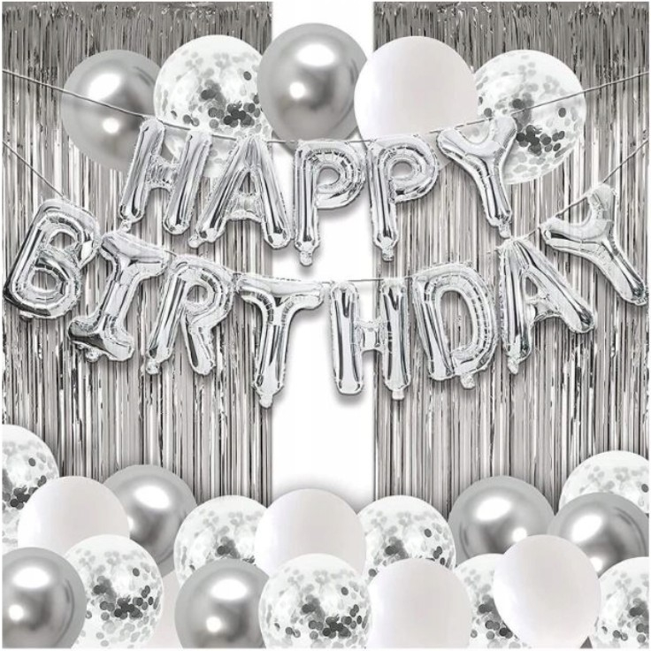 Set 24 de baloane folie si latex, , 10 baloane latex simple, 10 bloane latex cu paiete, 4 baloane folie, ribon, 1x2 m perdea, Argintiu