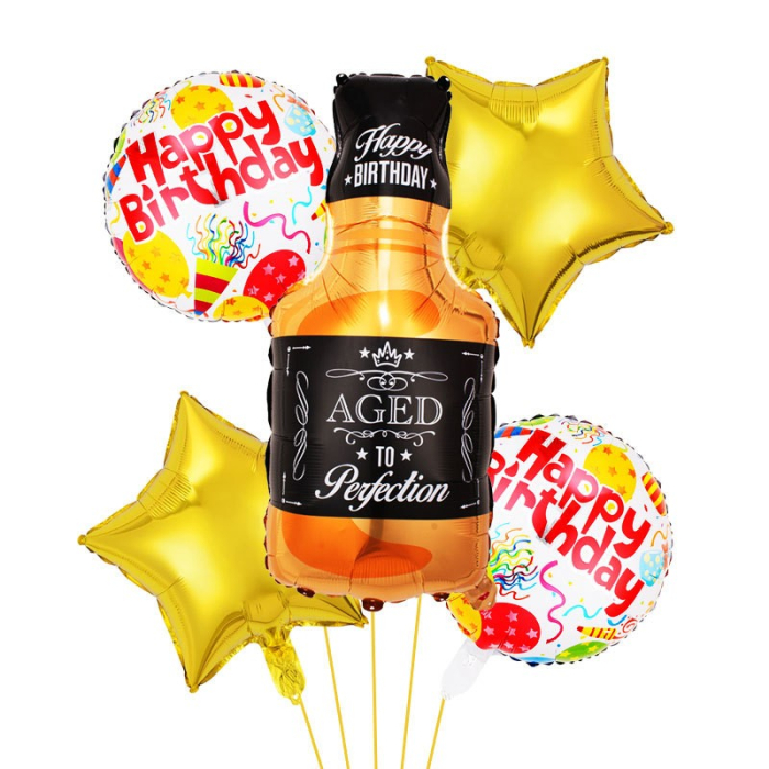 Set 5 Baloane din Folie Metalizata, , Figurine Sticla de Bautura, Model Stele, Tema Aniversare, Pai Inclus, Ambalaj Individual, Umflare cu Aer sau Heliu, Multicolor