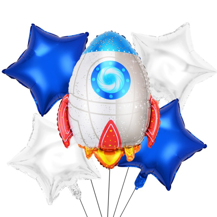 Set 5 baloane din folie metalizata HAPPY BIRTHDAY, , Figurina Model Racheta, Stelute Albastre, Adeziv si pai incluse, 78 x 45cm, Albastru Alb