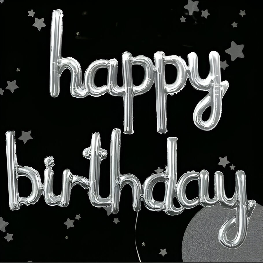 Set Baloane din Folie Metalizată, , Model Happy Birthday, 45x85 cm, 45x124cm, Baloane Party, Ambalaj Individual, Pai inclus, Umflare cu Aer sau Heliu, Argintiu