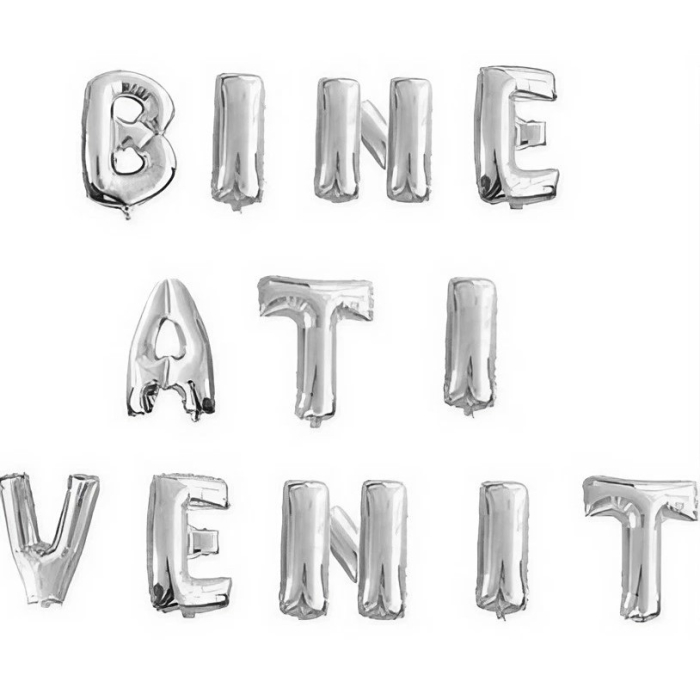 Set Baloane din Folie Metalizata, , Figurine Litere, Model Bine Ati Venit, Tema Aniversare, 40 cm, Ambalaj Individual, Pai inclus, Umflare cu Aer sau Heliu, Argintiu
