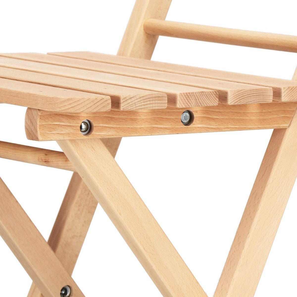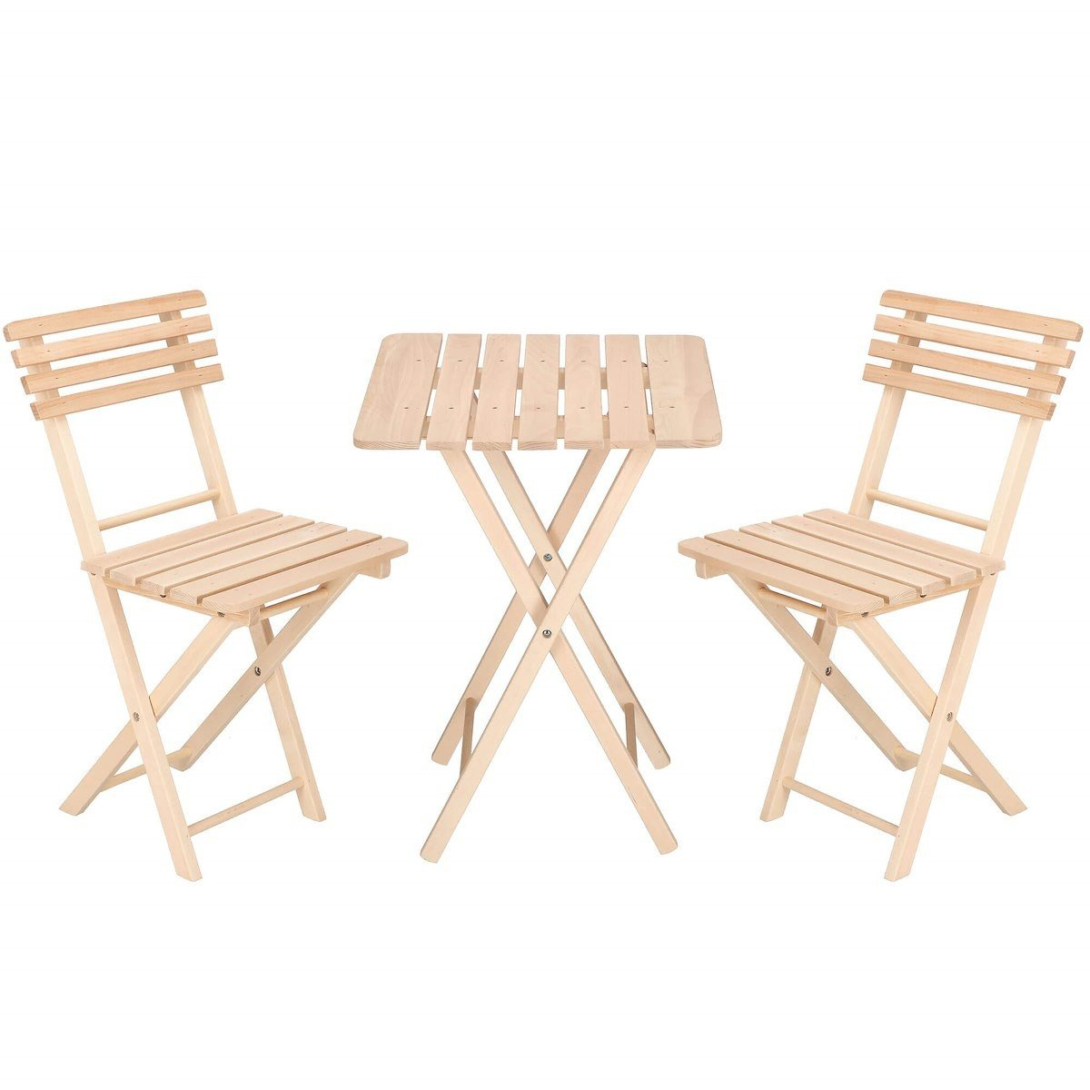 PARAMETRII: Material: lemnPentru autoimpregnare (nevopsit)Setul include: 2 scaune + 1 masaStructura pliabila DIMENSIUNI: Sezut scaun: latime: 42 cm / lungime: 30 cm / grosime: 1.5 cm Spatar scaun : latime: 42 cm / grosime trepte: 1.5 cm Dimensiunile per total scaun: latime: 42 cm / inaltime: 80 cm Dimensiuni scaun pliat: inaltime: 88 cm / latime: 20 cm Distanta dintre spatar si sezut: 22.5 cm Distanta de la sezut la podea: 48 cm Distanta dintre picioare: 28 cm   Blatul mesei: latime: 52 cm lungime: 52 cm grosime: 1.5 cm Dimensiuni masa pliata: Inaltime: 119 cm Latime: 10 cm Distanta blatului mesei de la sol (inaltimea totala): 75 cm