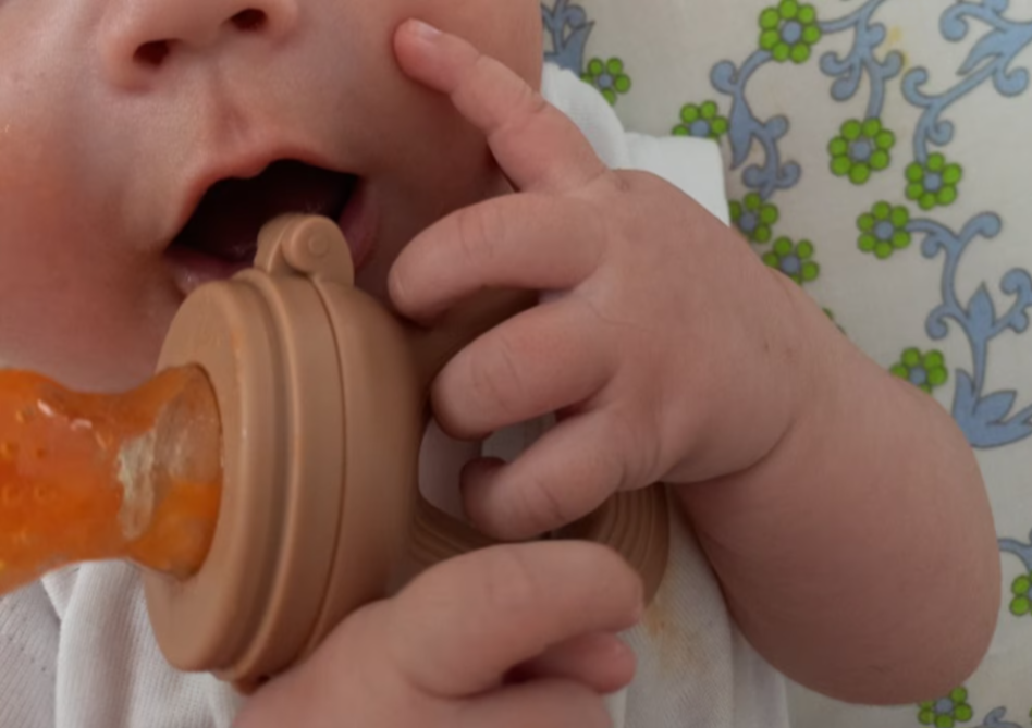 Raspuns 3: Se introduce in compartiment o bucata de fruct sau leguma, apoi suzeta se inchide si bebelusul o poate mesteca in siguranta. Orificiile mici permit trecerea sucului si pulpei fine, fara bucati mari.