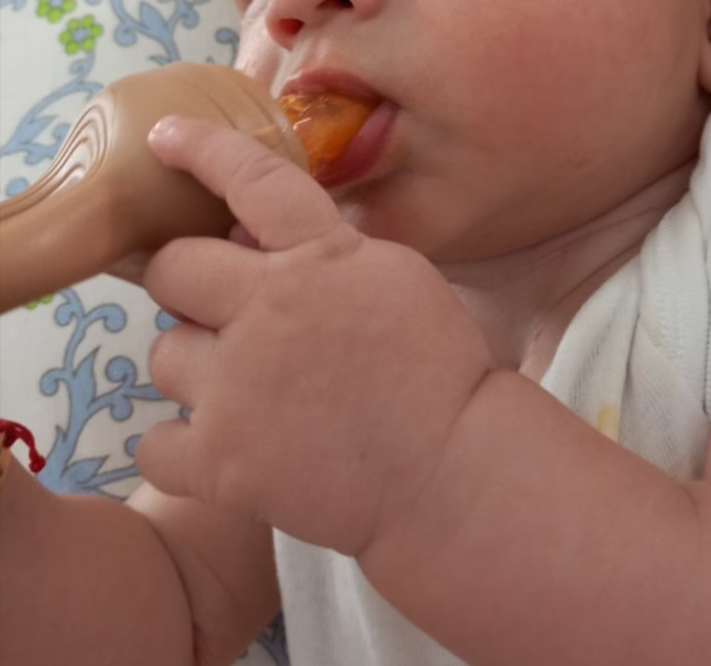 Raspuns 4: Da. Siliconul moale si textura fina ajuta la masarea gingiilor, fiind utila in timpul eruptiilor dentare. Poti pune fructe reci pentru un efect suplimentar de calmare.
