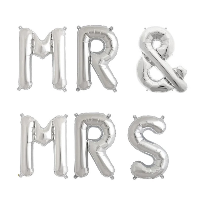 Set Baloane din Folie Metalizata, , Figurine Litere, Model MR&MRS, Tema Nunta, 40 cm, Baloane Party, Ambalaj Individual, Pai inclus, Umflare cu Aer sau Heliu, Argintiu