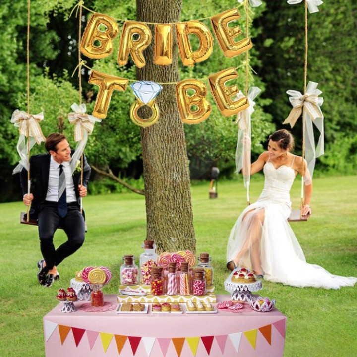 Set Baloane din Folie Metalizata, , Model Bride to Be cu Inel de Logodna, Litere de 40 cm, Baloane Party, Ambalaj Individual, Pai Inclus, Umflare cu Aer sau Heliu, Auriu