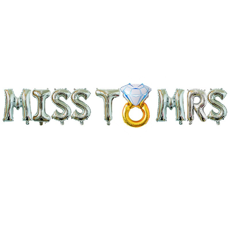 Set Baloane din Folie Metalizata, , Model Miss to Mrs cu Inel de Logodna, Litere de 40 cm, Tema Iubire, Baloane Party, Ambalaj Individual, Pai Inclus, Umflare cu Aer sau Heliu, Argintiu