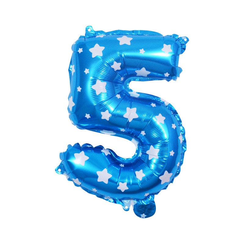 Balon din Folie Metalizata , Figurina Cifra, Imprimeu Stele, Tema Aniversare 80 cm, Ambalaj Individual, Pai inclus, Umflare cu Aer sau Heliu, Albastru, Cifra 5