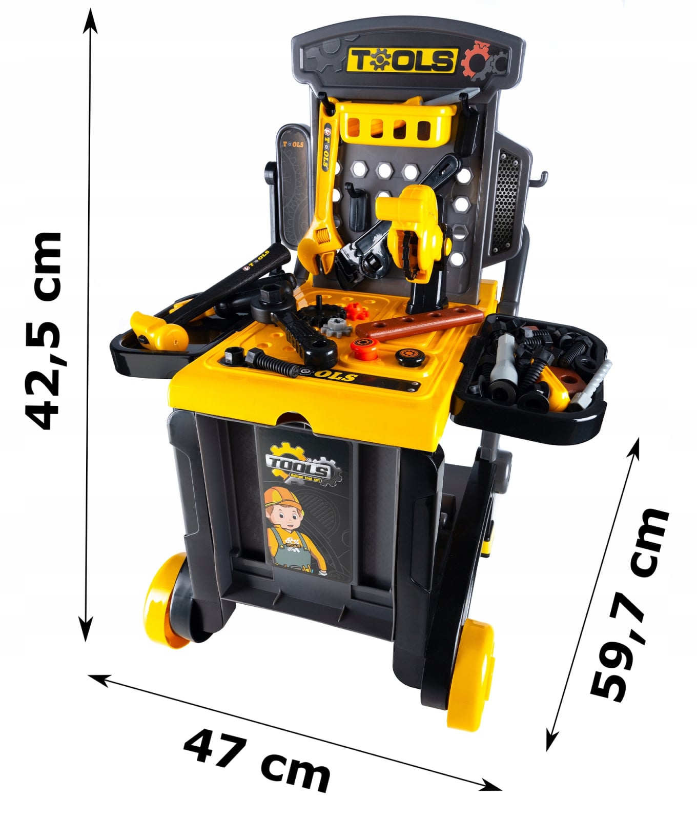 cufar de scule cu cheie Dimensiuni: 28x20x18cm 3x metode de asamblare: stand sau roaba sau carucior de scule Dimensiunile jucariei asamblate ca atelier (L/D/H): 46,5x42x59cm Dimensiunile ambalajului: 41x15,5x60cm Setul nostru ofera o multime de optiuni distractive - poate fi folosit ca ATELIER, carucior sau roaba pentru a transporta lucrurile necesare. Produsul poate fi usor transformat in jucaria de care avem nevoie.Fiecare unealta are propriul loc in valiza, ceea ce faciliteaza pastrarea ordinii si gasirea rapida a instrumentului de care aveti nevoie. Jucaria poate fi asamblata in 3 moduri: ca atelier, carucior de scule sau roaba. In plus, este inclusa si o lada de scule, disponibila cu fiecare dintre cele 3 moduri de asamblare.specificatii: Setul contine: Stand Atelier/cos/carucior Tabla de scule cu gauri, carlige si raft 2x organizatoare laterale Ferastrau cu lama mobila Set de suruburi si piulite 2x surubelnite cu biti interschimbabili Chei (cheie inelara, cheie reglabila, cheie cu soclu) Cleste Ciocan Placi cu gauri pentru insurubare Carlige, roti dintate etc. Jucarii potrivite pentru copii cu varsta de peste 3 ani. Copilul tau se va simti ca un adevarat mecanic care isi conduce minunatul atelier in timp ce se joaca cu acest set extraordinar de unelte. Baietilor mici le place sa traga cu ochiul si sa imite ceea ce face tata, bunicul sau fratele mai mare. Lasa-ti copilul sa se simta ca un adult pentru o clipa si echipeaza-l cu acest atelier extraordinar de tamplarie cu o multime de unelte - ore de distractie captivanta si amuzanta.