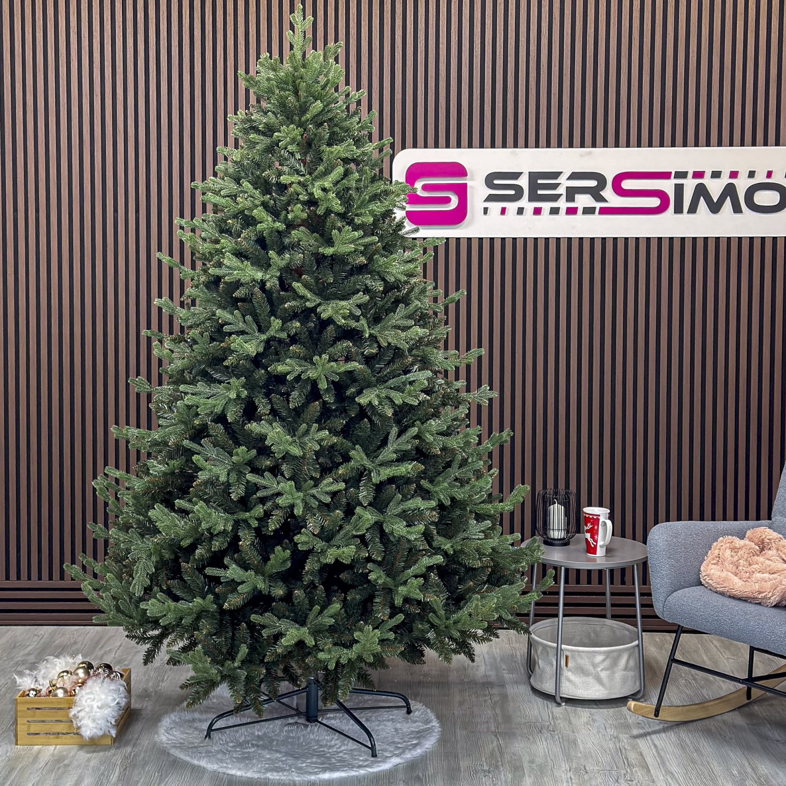 Imagine reala de prezentare pentru modelul Royal Felara, varianta 230cm PARAMETRII: – Inaltimea totala a bradului (dimensiune masurata de la podea pana in varf, cu tot cu suport): 250cm – Diametrul (latimea la baza in cel mai lat punct):  186cm – Numarul total al ramificatiilor: 2596  dintre care:– Crengute 2D, material PVC: 2175– Crengute 3D, material PE: 421– Suport inclus: metal– Zapada: NU– Alte decoratiuni: –– Sistem de prindere al crengilor cu balamale de tulpina tip "Umbrela" ce faciliteaza instalarea BRAD DE CRACIUN UNIC PENTRU CRACIUN UNIC Ce poate fi mai fermecator decat atmosfera unica a Craciunului? Si probabil ca niciunul dintre noi nu se indoieste ca un brad splendid impodobit este cel mai important element care construieste aceasta atmosfera magica de Craciun. La urma urmei, ritualul anual al impodobirii in familie a bradului de Craciun este unul dintre cele mai de neuitat momente, evocand multe amintiri frumoase. Bradul de Craciun prezentat va reflecta atmosfera minunata a Craciunului intr-un mod unic, si in acelasi timp atat de cunoscut si de indragit, subliniindu-i caldura si atmosfera de familie. DESCOPERA AVANTAJELE POMULUI NOSTRU DE CRACIUN – manopera precisa, imbinand soliditatea cu eleganta– densitate mare de ramuri si ace– distributie uniforma a acelor pe toata ramura – fara goluri– spatiu liber sub etajul inferior pentru cadouri– posibilitate de modelare a crengutelor in mai multe moduri– varietatea si realismul capetelor de crenguta– culoarea acelor imitand perfect acele naturale– diferentierea ramurilor – in functie de nivelul de inaltime– grosimea si durabilitatea firelor– fiabilitatea intregii structuri – arborele este aproape imposibil de distins de brazii naturali Cu bradul Christmas Deluxe by Sersimo® – un element inseparabil al Craciunului – veti petrece aceasta perioada magica de iarna intr-o aura de bucurie si caldura. Ganditi-va doar cat de frumos vor arata decoratiunile – stralucitoare, presarate cu sclipici, incalzind interiorul. Chiar si oamenii care nu impartasesc entuziasmul de Craciun recunosc ca un brad de Craciun impodobit frumos creeaza o atmosfera aparte. Cel mai mare avantaj al bradului nostru de Craciun este numarul mare de ramuri dens aranjate. Datorita densitatii si elegantei sale captivante, nu necesita prezenta a numeroase decoratiuni, fiind cu adevarat un decor grozav al oricarui interior! Etajul cel mai de jos al pomului de Craciun este la inaltimea potrivita, astfel incat sa puteti pune cu usurinta cadourile de Craciun sub el.Crengile pot fi indoite cu usurinta in diferite directii pentru a modela diferitele ramuri ale pomului si a le da forme diferite. Crengutele individuale au finaluri realiste si variate, iar niciuna nu este taiata intr-un mod artificial si inestetic. Culoarea lor intr-un mod extrem de realist imita culoarea reala a coniferelor si nu se estompeaza in timp. Sarma ascunsa cu grija nu se vede prin ace si, in acelasi timp, este suficient de groasa si rezistenta pentru ca bradul sa va serveasca ani de zile! Ace din folie PVC, puternice si durabile, sunt in acelasi timp extrem de placute la atingere. Deoarece bradul de Craciun – spre deosebire de copacii adevarati – nu ii pierde, nu va fi nevoie sa aspirati camera in mod regulat. Mai mult decat atat, acele sunt distribuite uniform pe toata lungimea ramurii, garantand astfel un efect vizual de densitate, fara goluri.