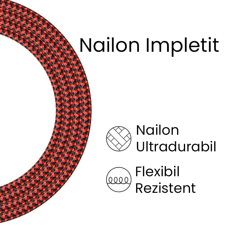 Cablu de date , conceput pentru utilizatorii de iPhone, ofera incarcare stabila si transfer rapid de date datorita portului USB-A spre Lightning. Cu o lungime generoasa de 2 metri, este ideal pentru utilizare confortabila acasa, la birou sau in masina, oferind libertate de miscare chiar si in timpul incarcarii. Designul impletit triunghiular in doua culori (rosu si negru) ii confera un aspect modern si o rezistenta sporita la indoire, uzura si rupere.