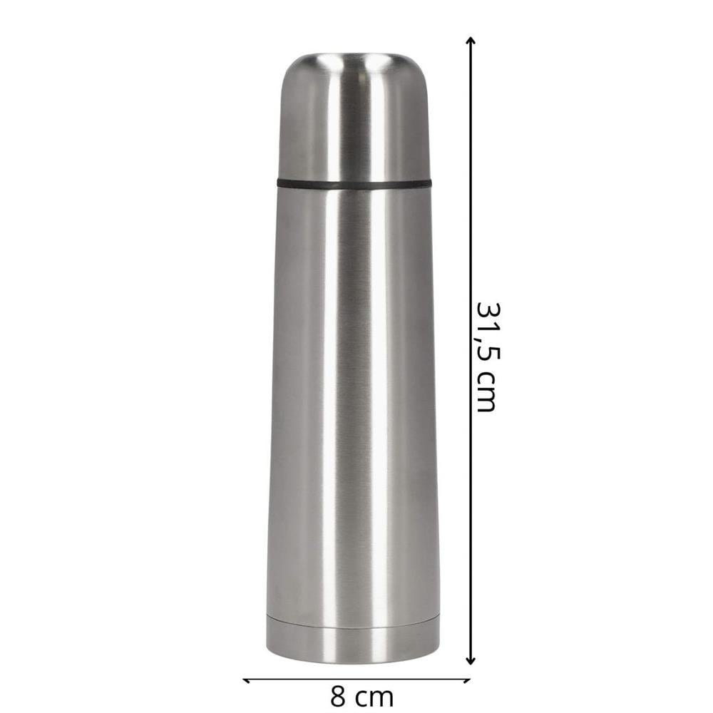 Material: otel inoxidabil 18/8 Capacitate: 1L Produs aprobat pentru contactul cu alimentele Dimensiuni: Inaltimea interna a termosului : 28 cm Inaltimea exterioara a termosului: 29 cm Inaltime totala: 31,5 cm Grosime in cel mai larg punct: 8 cm Grosime la punctul cel mai ingust: 8 cm: 5,3 cm Diametrul bazei: 8 cm Capac termos: 5,7 x 6 cm (H x L) Termosurile din otel au un numar mare de avantaje. Otelul inoxidabil nu absoarbe mirosurile, ceea ce elimina problema aromei de cafea sau de ceai atunci cand este reutilizat. Termosurile din otel inoxidabil sunt, de asemenea, durabile si nu ruginesc, asa ca va vor servi pentru o perioada lunga de timp. Este produsul ideal pentru calatorii!  Pastreaza bautura la temperatura perfecta timp de pana la 24 de ore!  Fabricat din otel inoxidabil - durabil, sigur pentru sanatate, usor de curatat, nu absoarbe mirosurile  Capacul etans - asigura transportul in siguranta, fara risc de scurgere, precum si deschiderea si inchiderea rapida si usoara  Siguranta - aprobat pentru contactul cu alimentele.  Versatila - perfecta pentru calatorii, munca, scoala.  Usor de pastrat curat - fara intretinere complicata, fara rugina Izolatia in vid presupune crearea unui vid intre cele doua straturi ale termosului. Acest lucru reduce schimbul de temperatura intre interior si exterior. Prin urmare, bauturile raman calde sau reci mult mai mult timp. Unicitatea acestui termos consta in simplitatea sa eleganta. Pur si simplu desurubati capacul si acesta se transforma intr-o ceasca practica