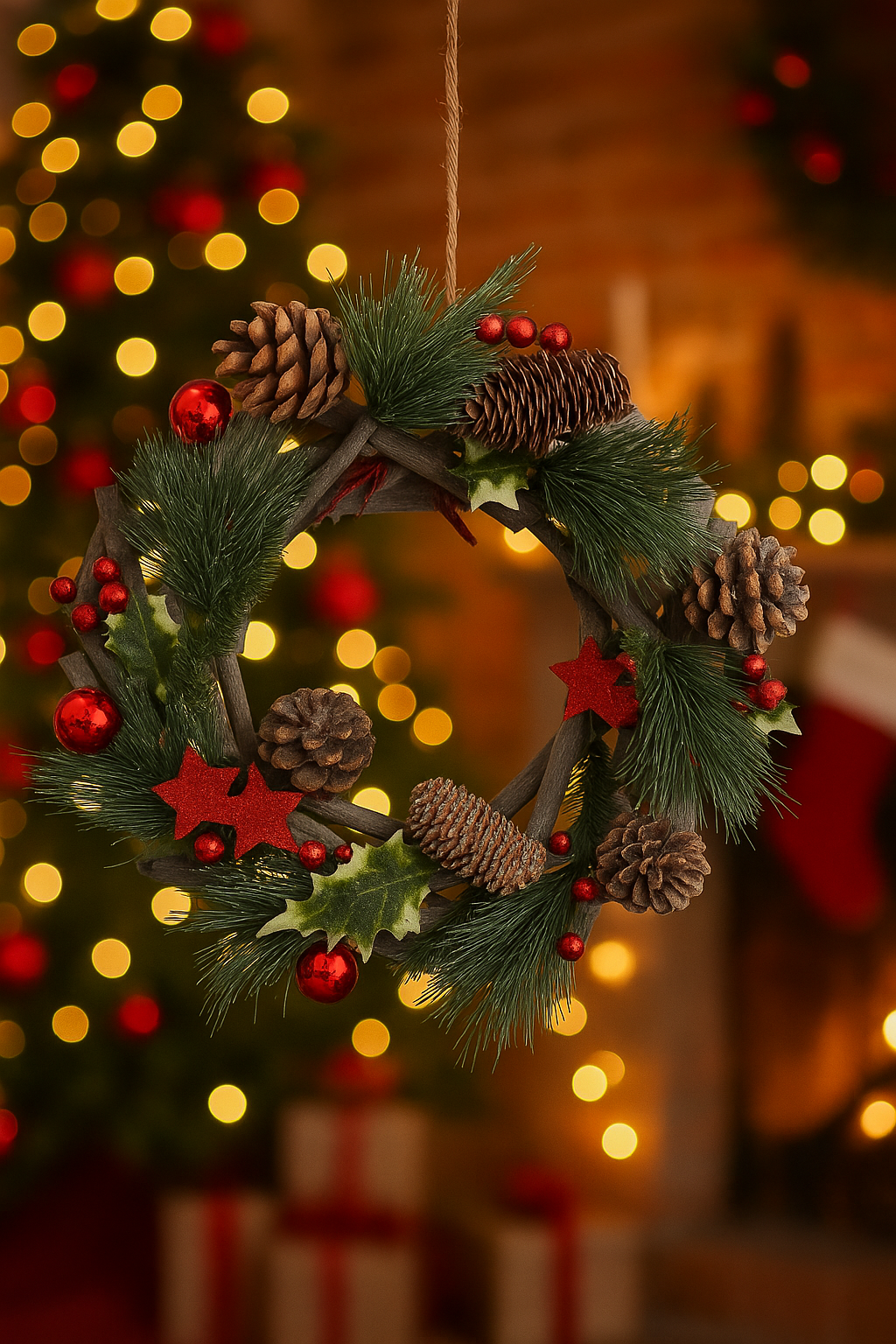 Specificatii tehnice: Material: PVC / plante uscate Dimensiuni produs: D.30 x P.8 cm Greutate produs: 0.563 kg Scurta descriere: Coronita decorativa cu crengute rosii aduce o nota festiva si calda oricarei incaperi. Realizata din PVC si plante uscate, este ideala pentru a fi agatata pe usa, pe perete sau folosita ca decor de masa in perioada sarbatorilor de iarna. Caracteristici principale: Design natural si elegant Realizata din crengute si plante uscate Culoare rosie intensa, cu accente traditionale Usor de agatat sau asezat pe masa Perfecta pentru decorul de Craciun