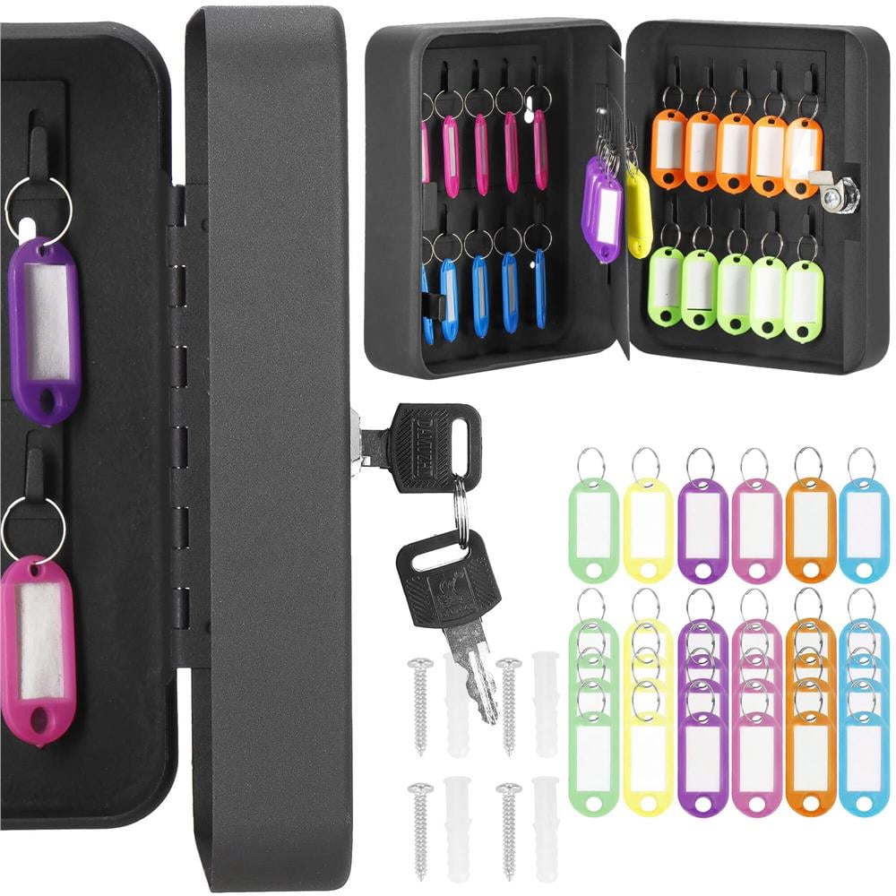 Culoarea carcasei: negru Culoare breloc: multicolor (mix) Material: otel Finisaj: mat Inchidere cu cheie: da Numarul de carlige pentru chei: 20 Numar de brelocuri: 20 Numarul de chei pentru carcasa: 2          Dimensiuni: Latime: 20 cm Adancime: 16 cm Inaltime: 7,5 cm Peretii grosi ai casetei asigura o buna protectie a cheilor din interior. Cu produsul nostru, puteti fi siguri ca nu veti pierde niciodata niciuna dintre cheile dumneavoastra. Constructia solida a casetei garanteaza siguranta si discretie. Daca profitati de oferta noastra, nu veti primi doar o carcasa rezistenta si durabila, ci si un set de etichete pentru chei. Cu ajutorul acestora, veti mentine ordinea si organizarea. Pentru a evita ca dulapul sa se piarda sau sa fie furat din greseala, montati-l pe perete! Dulapul are gauri pre-gaurite si veti primi in plus dibluri cu suruburi de la noi in kit. Produsul are culori discrete si universale, chiar si plasat pe perete nu va fi vizibil. Cutia de chei este un instrument extrem de util in multe medii. Suporturile pentru chei incluse faciliteaza pastrarea in ordine a cheilor depozitate. Incuietoarea cu cheie protejeaza continutul Fabricat din materiale durabile si puternice Inclus: elemente de montare / brelocuri de chei Echipat cu 20 de carlige pentru chei Incuiat cu cheie de blocare Culori discrete Poate fi combinat cu alte accesorii Poate fi montat pe perete Interiorul are un separator mobil cu carlige pentru o capacitate de depozitare mai mare