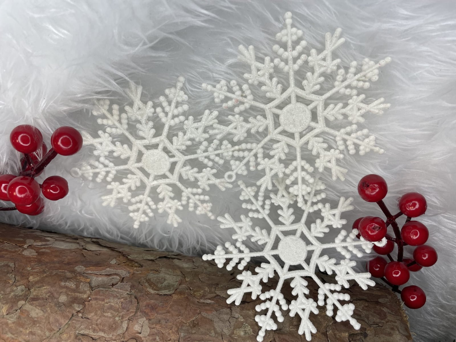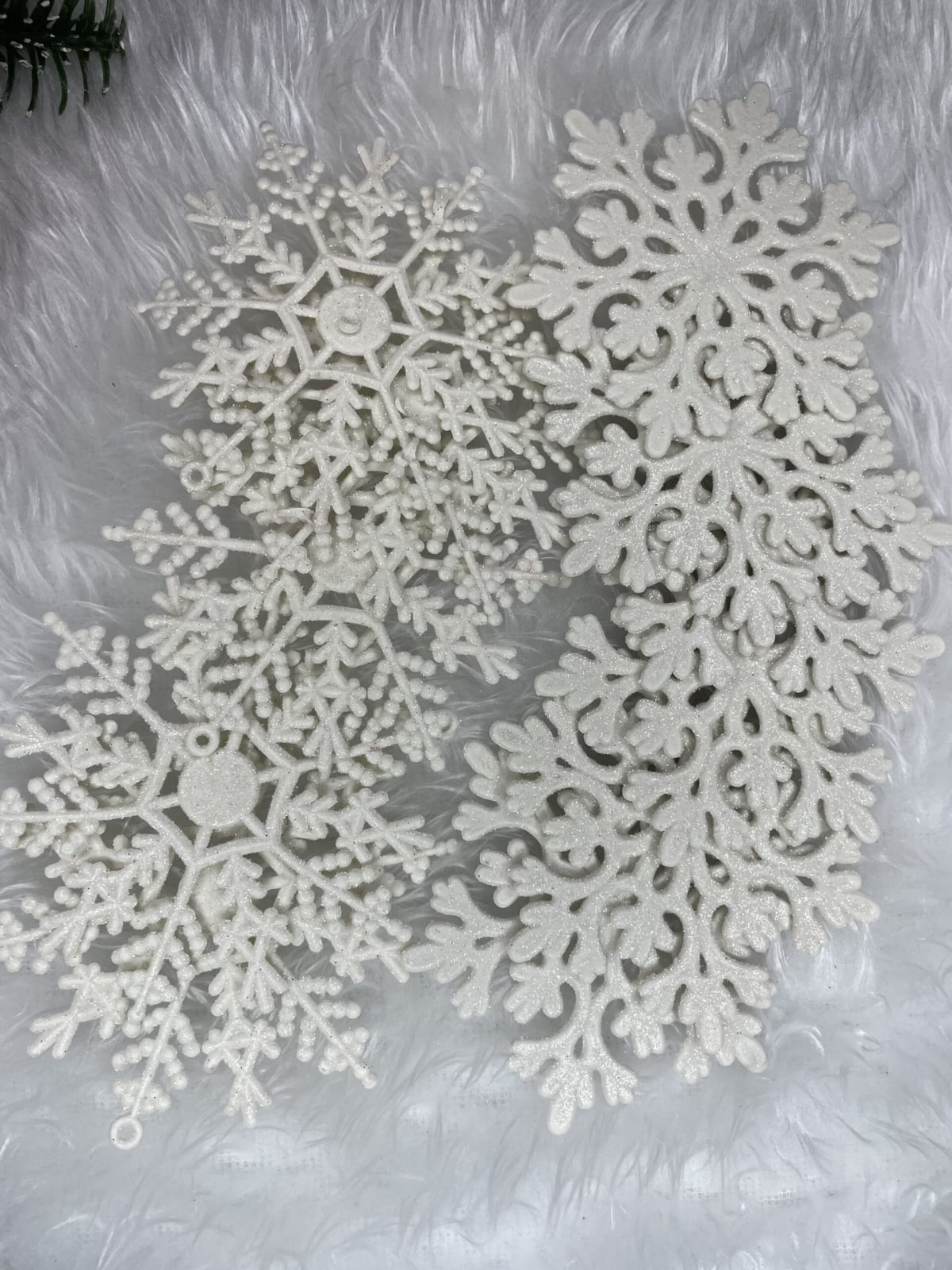 Material: PP Diametru: 9, 10 cm Cantitate in pachet: 12 bucati Numar de modele: 2 Finisaj: sclipici Culoare alba In plus: sfori pentru agatat Craciunul, ca si intreaga perioada de iarna, este o perioada magica, plina de caldura si de o atmosfera unica, creata datorita unui spectacol de decoratiuni fabuloase si constelatii luminoase incantatoare. Pandantivele frumoase in forma de fulgi de zapada va vor decora frumos bradul de Craciun. Setul este format din 12 fulgi de zapada cu decupaje frumoase. Pandantivele sunt insotite de o sfoara pentru a le agata pe crengile bradului de Craciun. Realizat cu grija - cu atentie la cel mai mic detaliu Vine cu o sfoara decorativa - nu trebuie sa va faceti griji cu privire la problemele de agatat Indestructibil - sigur pentru casele cu copii si animale de companie Copiii carora le place sa impodobeasca bradul, precum si o pisica care vaneaza cu insistenta un brad de Craciun, se vor putea bucura de aceasta perioada speciala fara teama de a se rani. Vei ramane calm chiar daca unul dintre pandantivele noastre iti cade din maini.