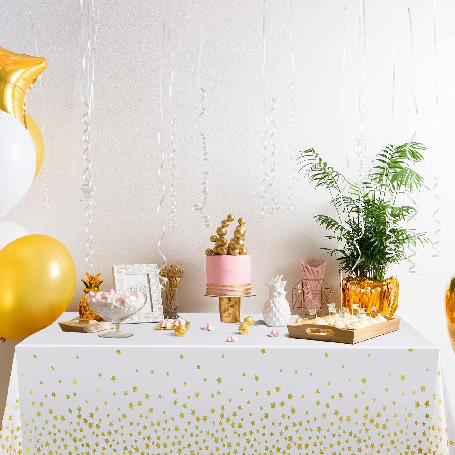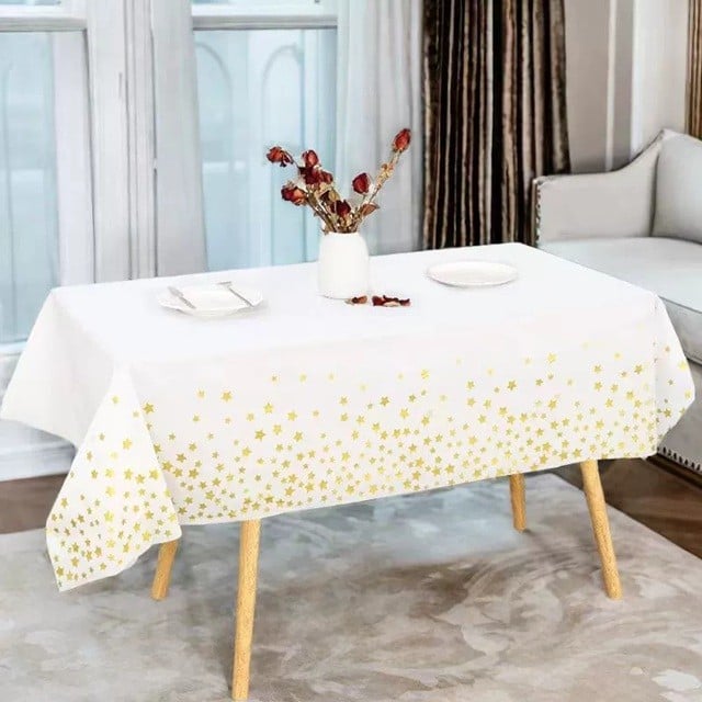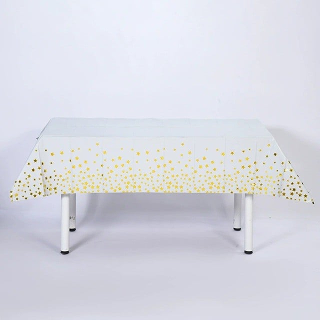 Fata de Masa, , din Folie, Imprimeu Stele Aurii, Impermeabila, 137 x 274 cm, Alb
