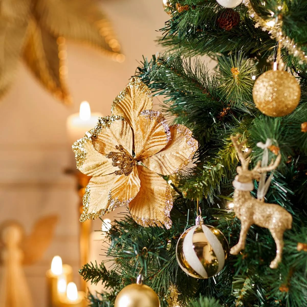 Specificatii tehnice Culoare: Auriu Material: Poliester, otel Dimensiuni produs: D. 24 x P. 11 cm Scurta descriere Floare decorativa poinsettia aurie, realizata din poliester si otel, ideala pentru decoratiuni de Craciun. Poate fi integrata in aranjamente festive, coronite sau brazi, adaugand o nota de stralucire eleganta. Caracteristici principale Culoare aurie cu aspect metalizat Material textil de calitate si tija flexibila din otel Usor de integrat in aranjamente decorative Potrivita pentru masa, brad sau ghirlande