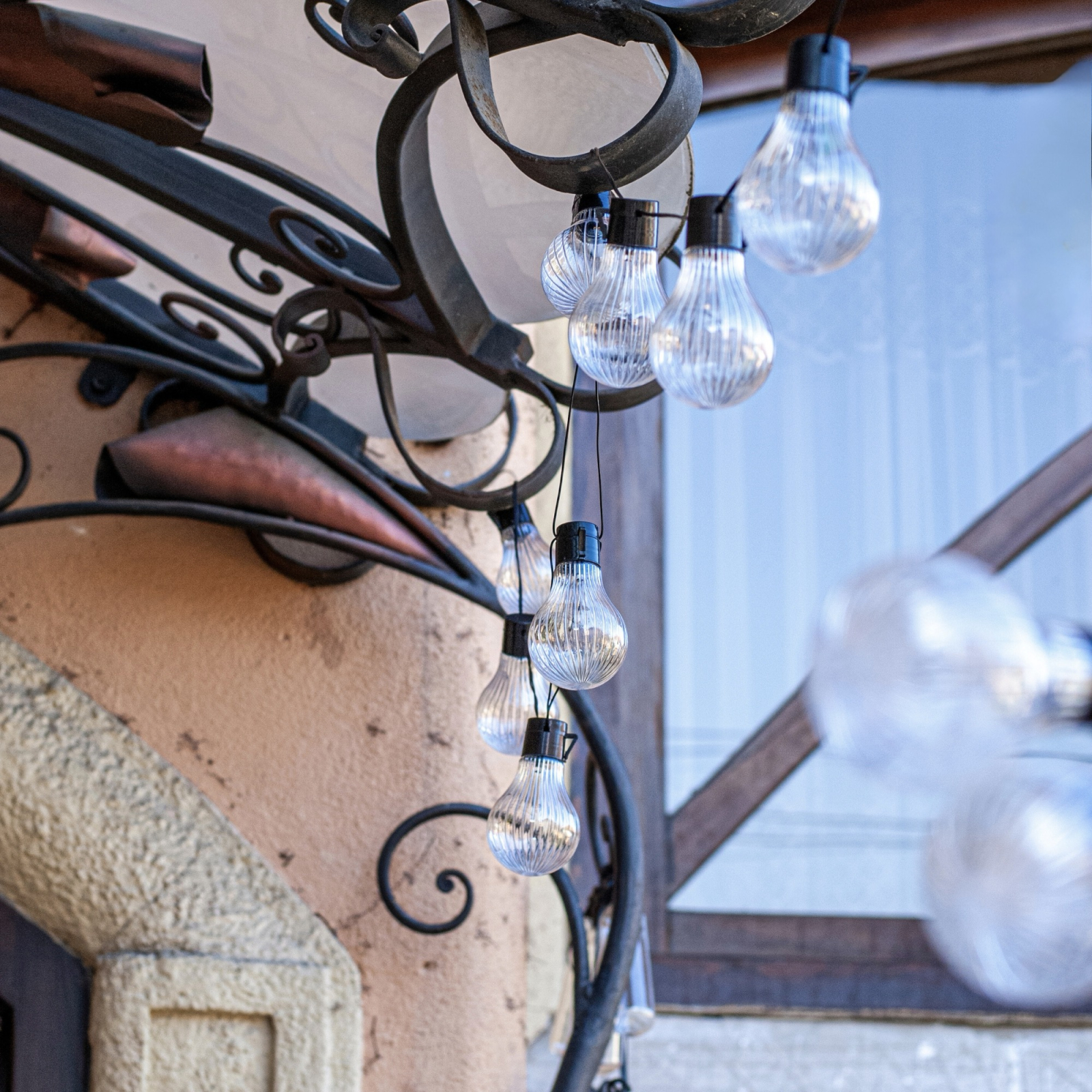 Specificatie: Senzor de crepuscul: da Lungime totala: 580cm (200cm pentru alimentare + 380cm) Material carcasa: PVC Comutator: Da Lumina: alb cald Utilizarea unei lampi solare asigura cantitatea potrivita de lumina la intrarea in casa, garaj, subsol sau orice alt loc in care vizibilitatea este limitata semnificativ dupa apusul soarelui, de exemplu o gradina. Ghirlandele sunt un element minunat al oricarei seri de atmosfera. Ghirlandele schimba atmosfera locului de indata ce incep sa straluceasca cu lumina lor calda si blanda. Ghirlanda are 10 becuri LED care sunt plasate pe un cablu cu o lungime totala de 3,8 m. Lampa este destinata utilizarii in aer liber si trebuie expusa la lumina soarelui in timpul zilei pentru a incarca eficient bateria.Este realizat din material durabil, ceea ce contribuie la durabilitate si viata lunga.In plus fata de avantajul sau practic incontestabil, cu siguranta va face mai atractiva petrecerea timpului in aer liber cu familia, prietenii sau singuri.