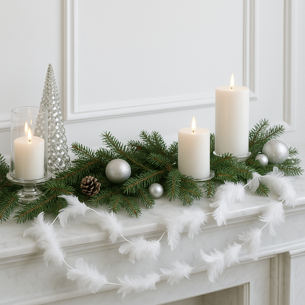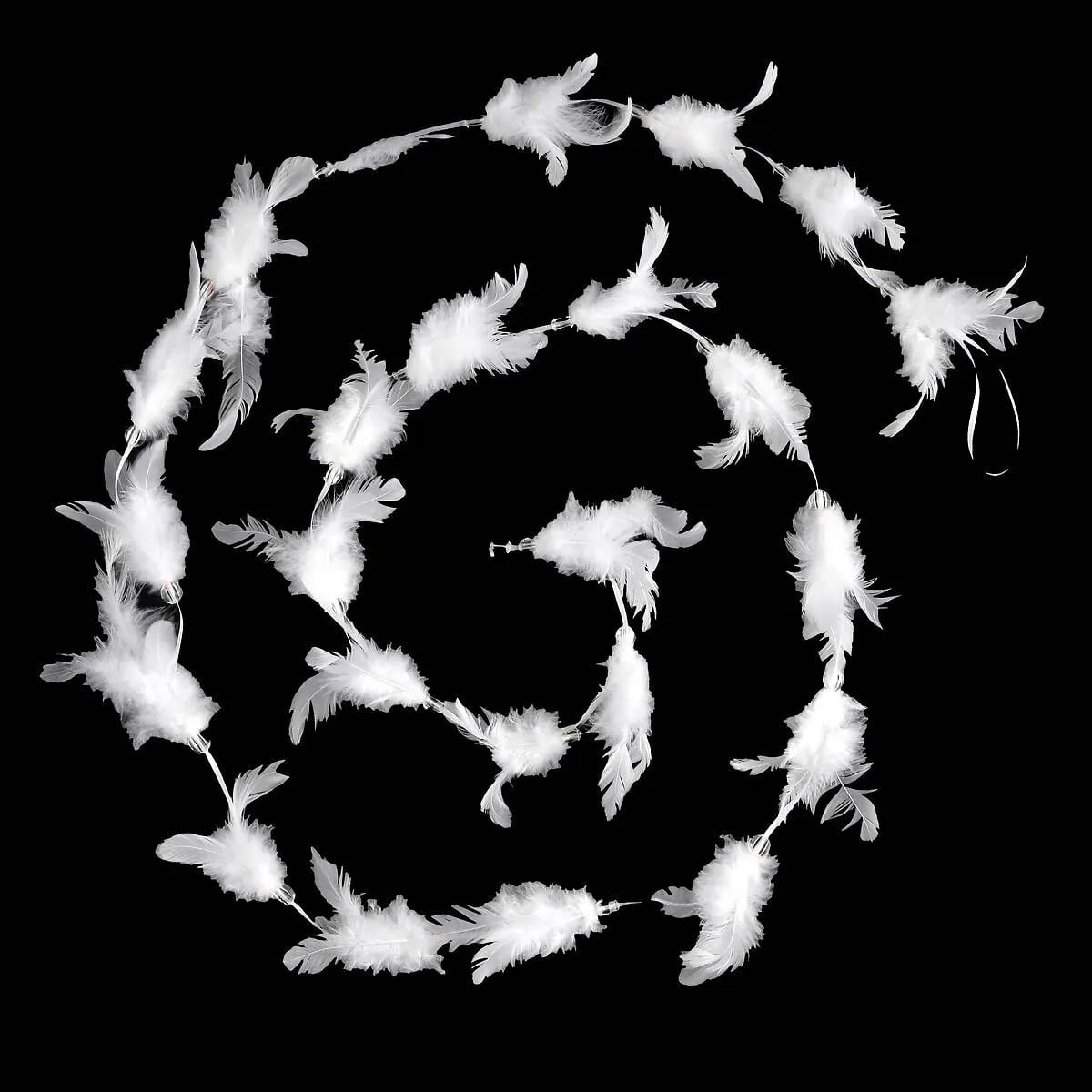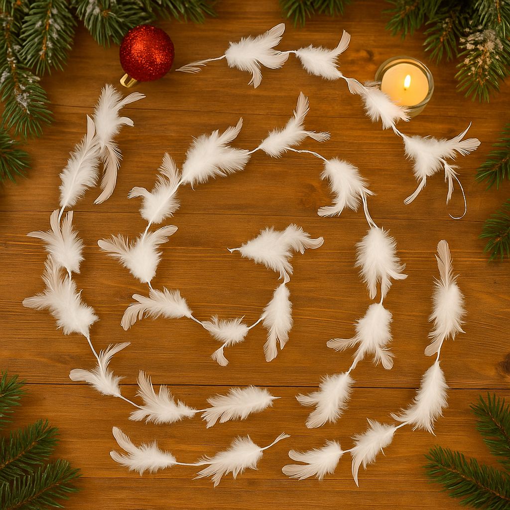 Ghirlanda pentru decor sau bradul de Craciun, model puf si pene, 200cm, alb